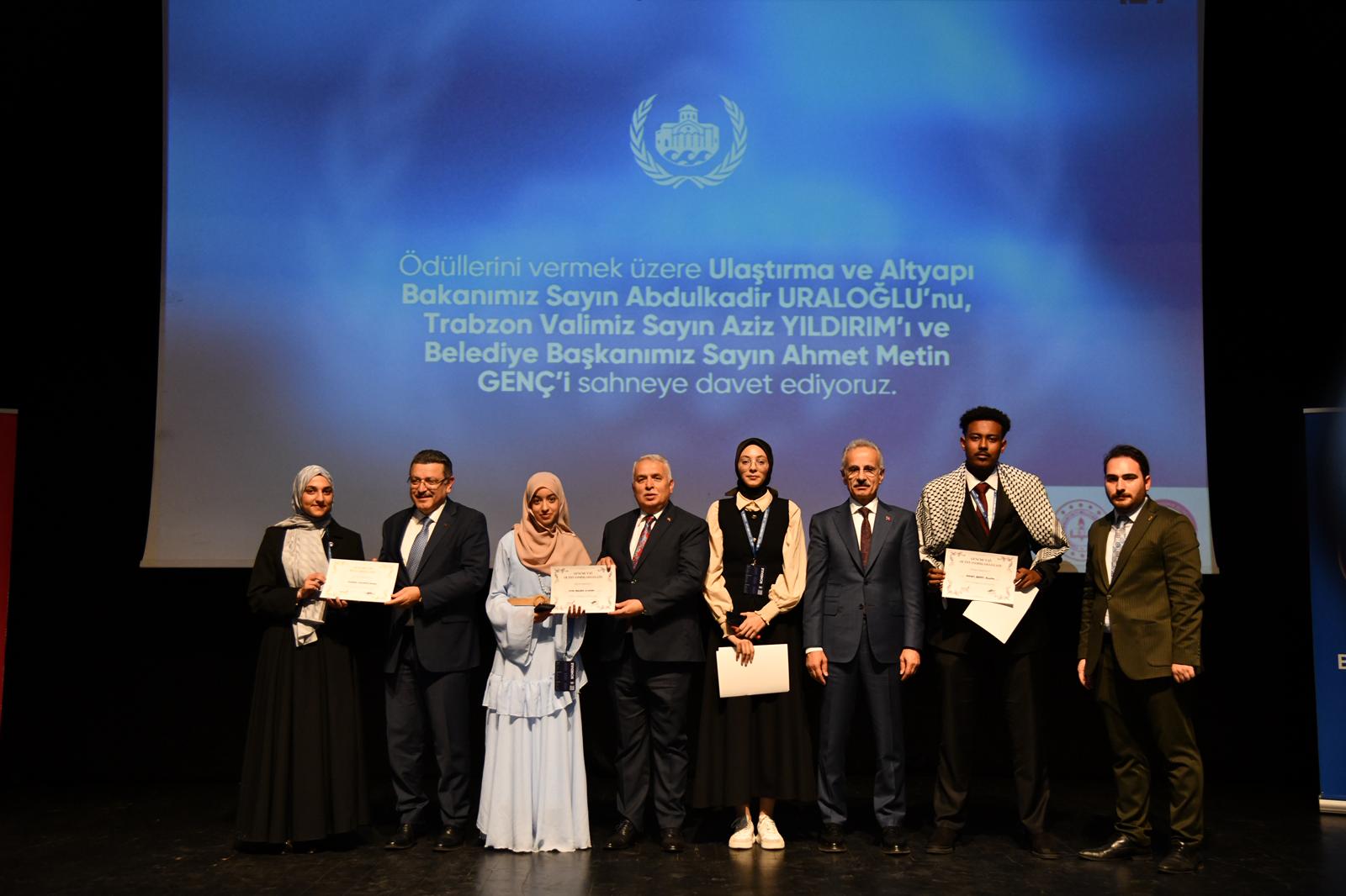 Ulaştırma ve Altyapı Bakanı Abdulkadir Uraloğlu da gençlere seslenerek, “Ben sizlere bakarken gözlerinizde sadece bir lise öğrencisi değil; geleceğin dışişleri bakanlarını, büyükelçilerini, Birleşmiş Milletler Genel Sekreterini belki de yeniden yapılanacak bir dünya düzeninde o yapının yeni genel sekreterini görüyorum. Sizler bizim geleceğimizsiniz. Ve inanın bana, bu ülkenin en büyük sermayesi elbette sizlersiniz. Sevgili genç kardeşlerim; Birleşmiş Milletler 1945 yılında neden kuruldu? İkinci Dünya Savaşı’nın yıkıcı sonuçlarından ders alınarak, 'Bir daha asla' denilerek kuruldu. Ancak ne yazık ki bugün hala Gazze’de, İran’da, şu anda Sudan’da ve dünyanın pek çok yerinde çatışmalar, acılar, zulümler devam ediyor. İşte sizler bu konferansta tam da bu nedenle buradasınız. Ülkemizin birçok şehrinden gelerek Trabzon’da buluştunuz. Bu anlamlı organizasyonu gerçekleştiren herkese teşekkür ediyorum. Dünyanın sorunlarını konuşmak yetmiyor; bu sorunlara çözüm üretmek, öneriler geliştirmek zorundayız. Ben de bir bakan olarak değil, bir ağabeyiniz, bir kardeşiniz olarak şunu ifade etmek isterim: Dünya meselelerini çözmenin ilk şartı güçlü bir ülke olmaktır. Masada sözünüz geçmiyorsa, kürsüde ne kadar güzel konuşursanız konuşun, alınan kararlar sizin lehinize olmayacaktır. Gerçek budur. İşte bu nedenle Cumhurbaşkanımız Sayın Recep Tayyip Erdoğan’ın liderliğinde son 23 yılda yaptığımız şey tam olarak budur. Türkiye’yi sahada bileği bükülmeyen bir ülke haline getirerek masada sözünü dinleten bir güç seviyesine taşımak. Bugün tüm dünya Cumhurbaşkanımız Sayın Recep Tayyip Erdoğan’ın Türkiye adına ne söylediğine kulak veriyor” diye konuştu. Ödül töreninin ardından program sona erdi.