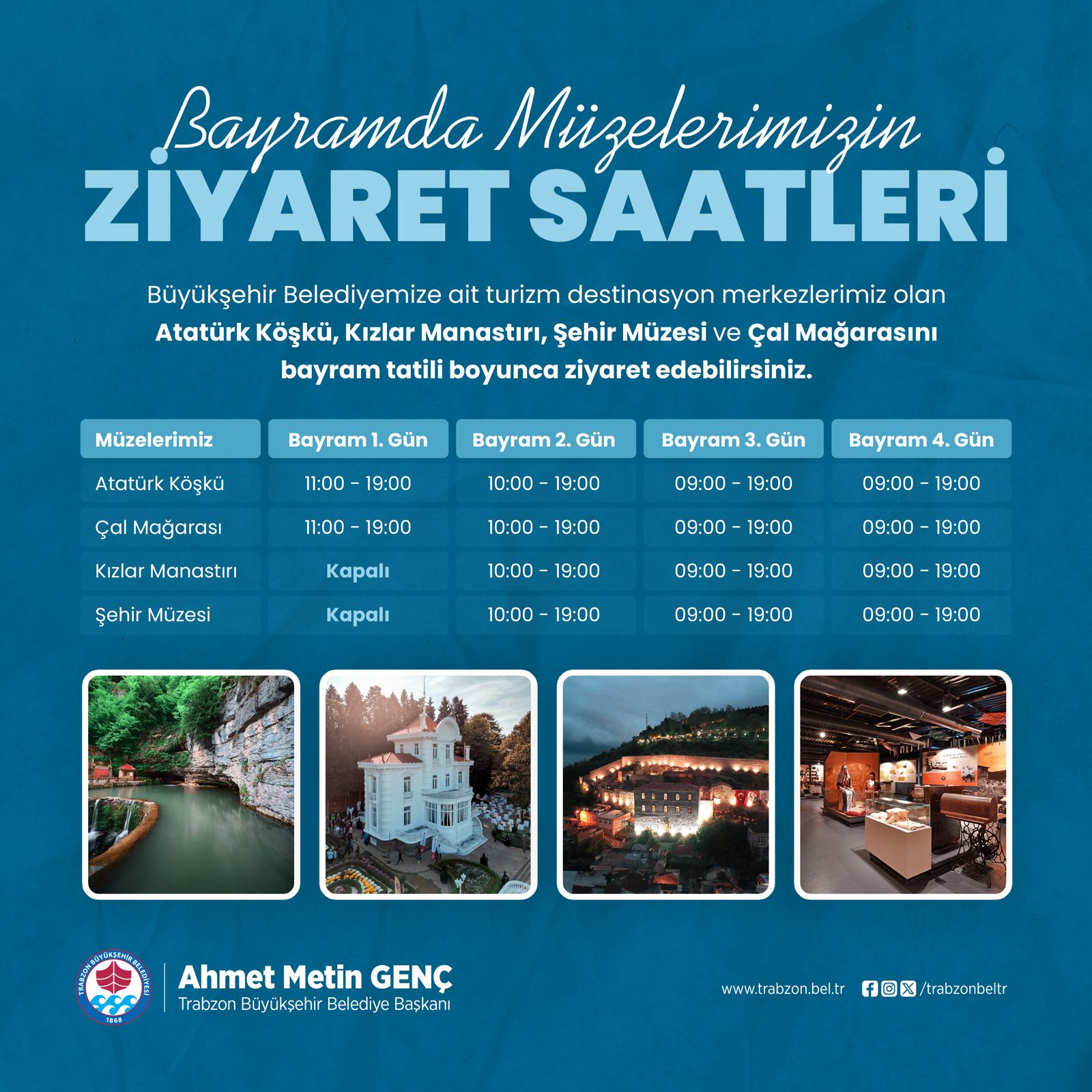 Trabzon Büyükşehir Belediyesi, Kurban Bayramı dolayısıyla bünyesinde bulunan müze ve ören yerlerinin ziyaret saatlerinde değişiklik yapıldığını açıkladı. Buna göre; Atatürk Köşkü ve Çal Mağarası bayramın 1. günü 11.00-19.00, 2. günü 10.00-19.00, 3. ve 4. günü ise 09.00-19.00 saatleri arasında ziyaret edilebilecek. Kızlar Manastırı ve Şehir Müzesi bayramın ilk günü ziyarete kapalı olacak. Bu yerler, bayramın 2. günü 10.00-19.00, 3. günü 09.00-19.00, 4. günü ise 09.00-19.00 saatleri arasında gezilebilecek.