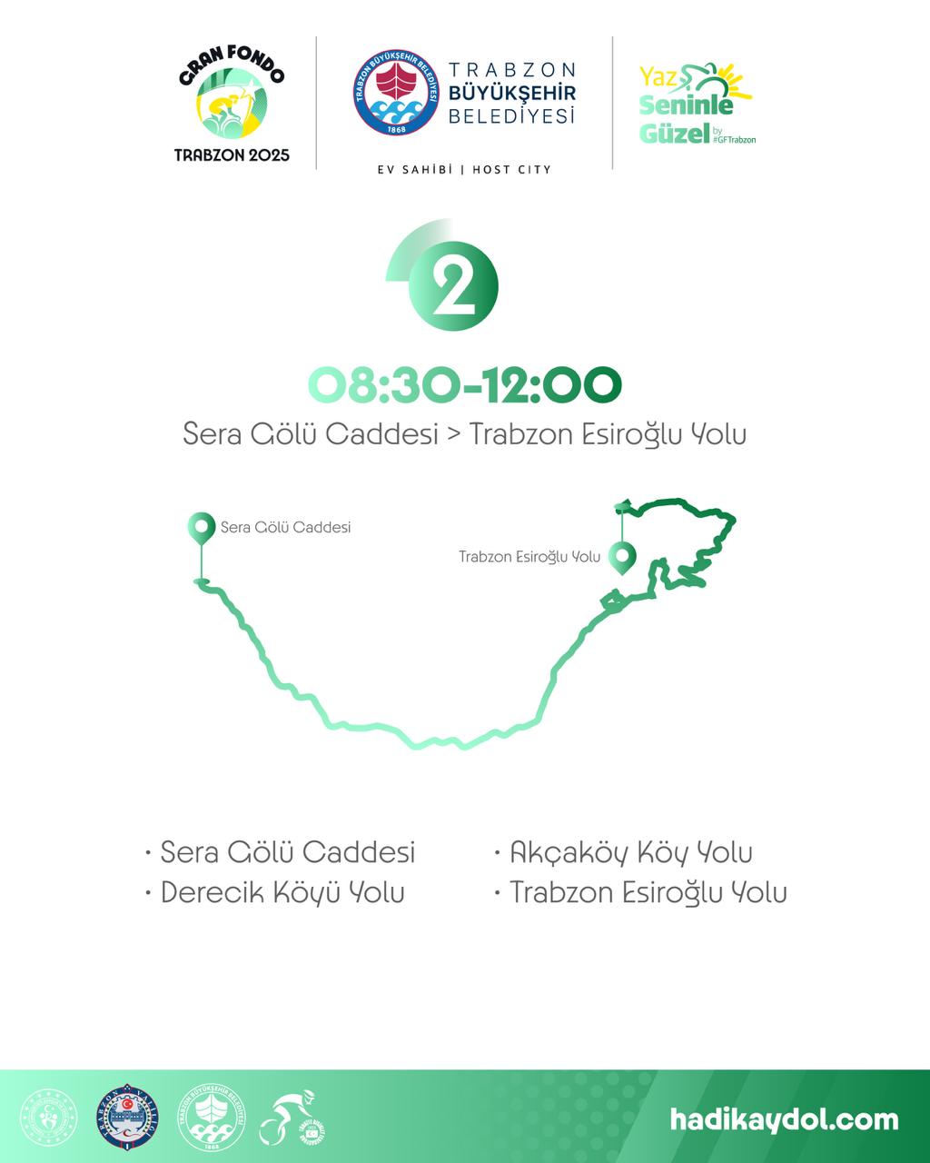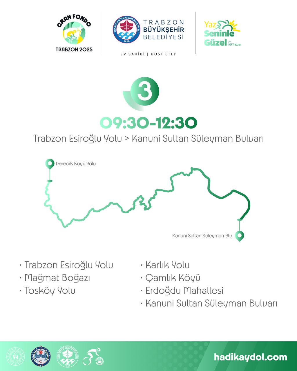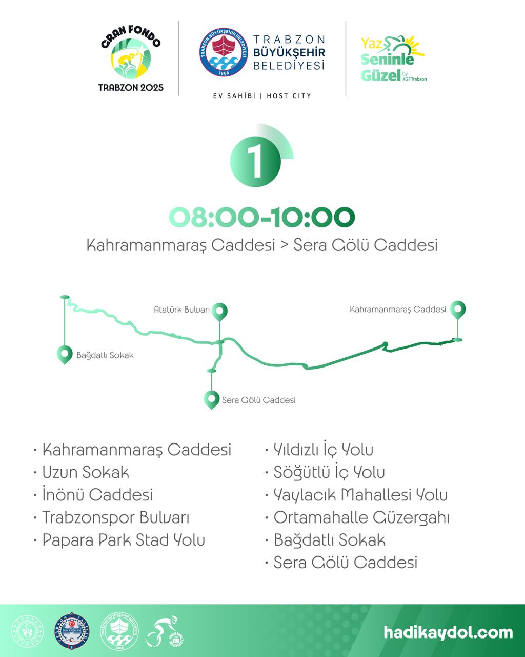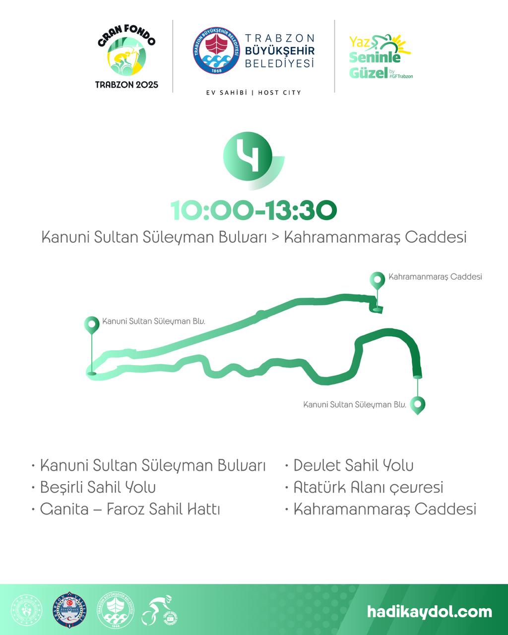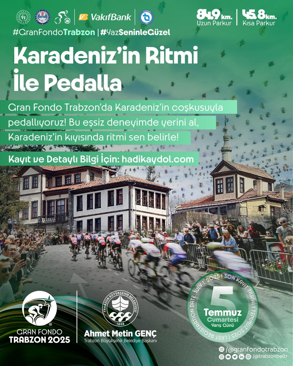 Trabzon Büyükşehir Belediyesi’nin ev sahipliğinde, Gençlik ve Spor Bakanlığı, Trabzon Valiliği ve Türkiye Bisiklet Federasyonu iş birliğiyle düzenlenecek olan ve Kahramanmaraş Caddesi’nden start alacak Gran Fondo Trabzon yarışı, 5 Temmuz’da gerçekleştirilecek. Yarış günü, etkinlik kapsamında bazı yollar belirli saat aralıklarında trafiğe kapatılacak.