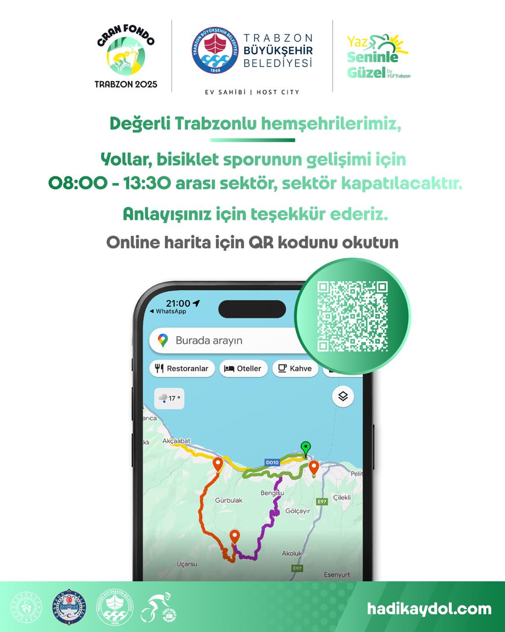 Trabzon Büyükşehir Belediyesi’nden yapılan açıklamada, “5 Temmuz Cumartesi günü Büyükşehir Belediyemizin ev sahipliğinde gerçekleşecek Gran Fondo Trabzon yarışında, sporcuların güvenliği ve organizasyonun sağlıklı bir şekilde ilerleyebilmesi adına bazı güzergahlarda geçici trafik düzenlemesi yapılacaktır. Trabzon’un uluslararası spor organizasyonlarına ev sahipliği yapmasında gösterdiğiniz anlayış ve destek için teşekkür ederiz. Kısa süreli bu değişikliklere sabrınız için minnettarız. Birlikte pedallıyoruz, birlikte kazanıyoruz” ifadelerine yer verildi.
