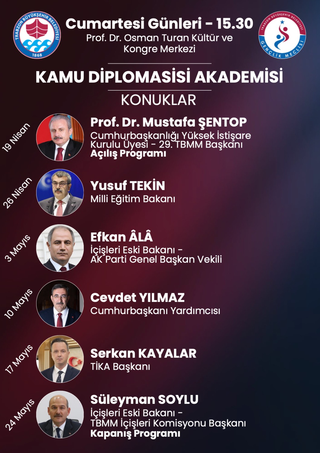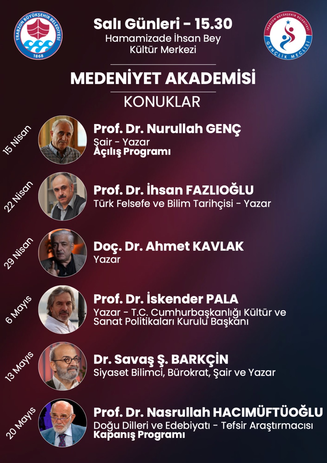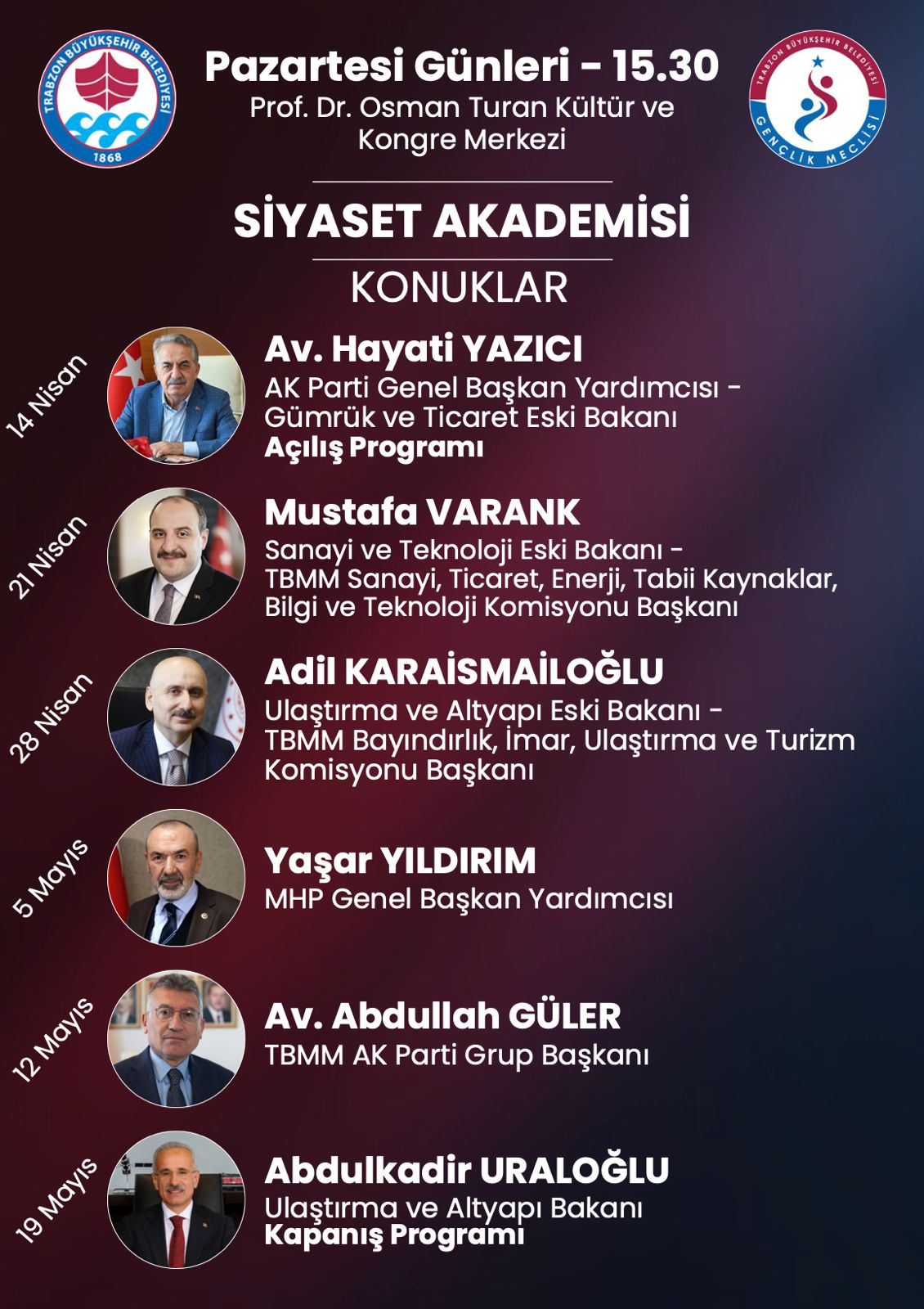 Siyaset Akademisi programına; 14 Nisan’da Hayati Yazıcı, 21 Nisan’da Mustafa Varank, 28 Nisan’da Adil Karaismailoğlu, 5 Mayıs’ta Yaşar Yıldırım, 12 Mayıs’ta Abdullah Güler ve 19 Mayıs’ta Abdulkadir Uraloğlu katılacak. Açılış programı ise 12 Nisan’da TBMM Eski Başkanı İsmail Kahraman’ın katılımıyla gerçekleştirilecek. Medeniyet Akademisi kapsamında; 15 Nisan’da Prof. Dr. Nurullah Genç, 22 Nisan’da Prof. Dr. İhsan Fazlıoğlu, 29 Nisan’da Doç. Dr. Ahmet Kavlak, 6 Mayıs’ta Prof. Dr. İskender Pala, 13 Mayıs’ta Dr. Savaş Barkçin ve 20 Mayıs’ta Prof. Dr. Nasrullah Hacımüftüoğlu gençlerle bir araya gelecek. Medya Akademisi programlarında ise; 17 Nisan’da Ömer Faruk Tanrıverdi, 24 Nisan’da Adem Metan, 1 Mayıs’ta Hamza Özdemir, 8 Mayıs’ta İlker Astarcı, 15 Mayıs’ta Orhan Toker ve 22 Mayıs’ta Mustafa Şen tecrübelerini paylaşacak. Hukuk Akademisi oturumlarında; 18 Nisan’da Prof. Dr. Cüneyt Yüksel, 25 Nisan’da Dr. İsmail Emrah Karayel, 2 Mayıs’ta Abdulhamit Gül, 9 Mayıs’ta Hüseyin Aydın, 16 Mayıs’ta Esma Aksoy ve 23 Mayıs’ta Şeref Malkoç bilgi ve birikimlerini aktaracak. Kamu Diplomasisi Akademisi ise; 19 Nisan’da Prof. Dr. Mustafa Şentop, 26 Nisan’da Yusuf Tekin, 3 Mayıs’ta Efkan Ala, 10 Mayıs’ta Cevdet Yılmaz, 17 Mayıs’ta Serkan Kayalar ve 24 Mayıs’ta Süleyman Soylu’nun katılımlarıyla gerçekleşecek. Tüm akademilerin kapanış programı ise 25 Mayıs’ta Türkiye Büyük Millet Meclisi Başkanı Prof. Dr. Numan Kurtulmuş’un katılımıyla yapılacak. Akademilere katılmak isteyen gençler, 9 Nisan'a kadar Trabzon Büyükşehir Belediyesi'nin resmi internet sitesi trabzon.bel.tr adresindeki 'etkinlikler' bölümünden online olarak başvuru yapabilecek.