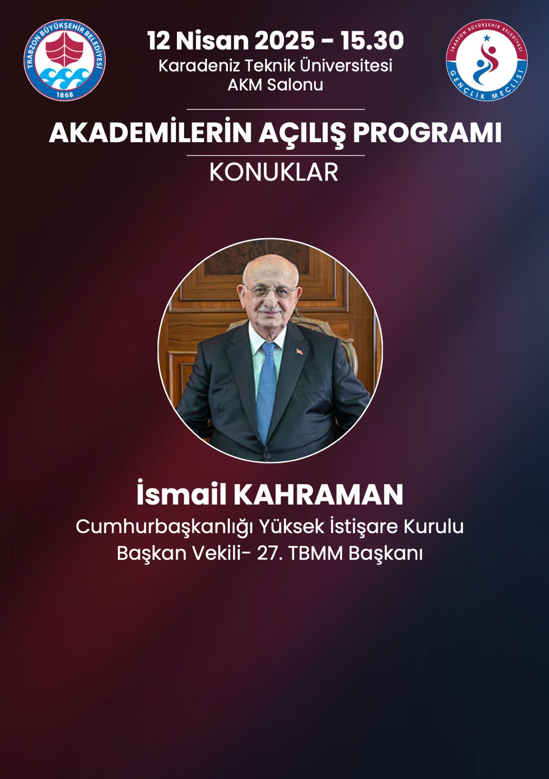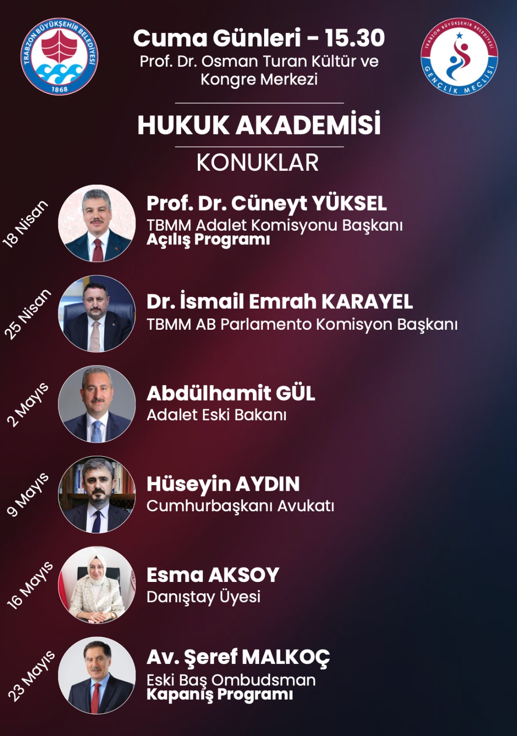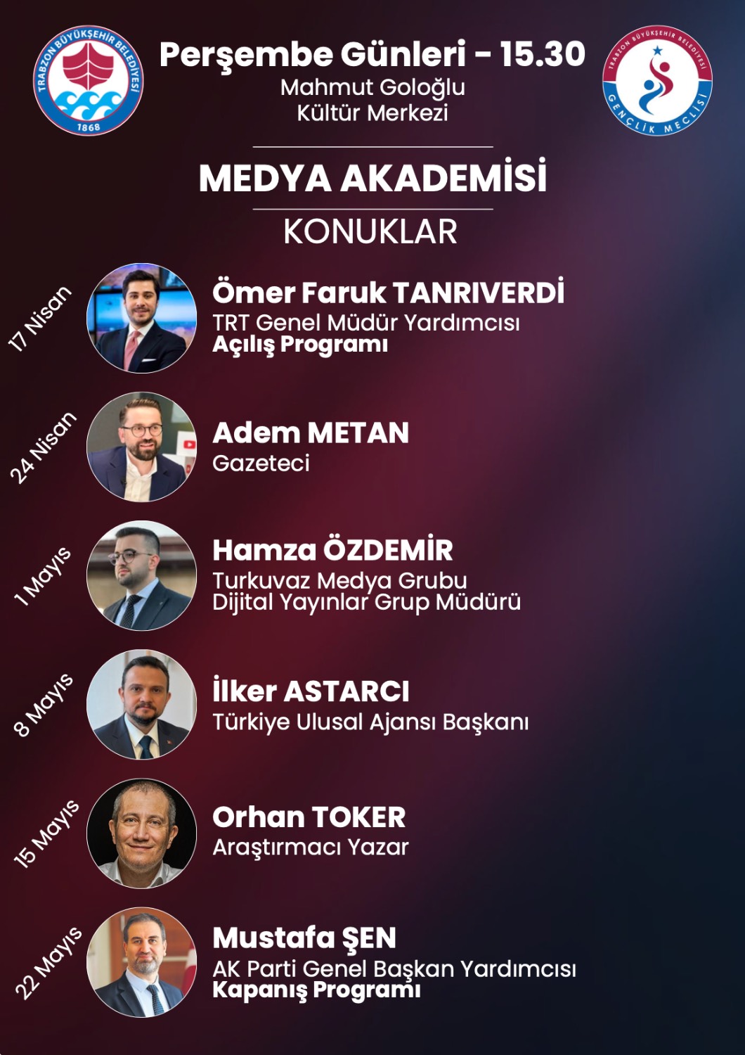 Siyaset Akademisi programına; 14 Nisan’da Hayati Yazıcı, 21 Nisan’da Mustafa Varank, 28 Nisan’da Adil Karaismailoğlu, 5 Mayıs’ta Yaşar Yıldırım, 12 Mayıs’ta Abdullah Güler ve 19 Mayıs’ta Abdulkadir Uraloğlu katılacak. Açılış programı ise 12 Nisan’da TBMM Eski Başkanı İsmail Kahraman’ın katılımıyla gerçekleştirilecek. Medeniyet Akademisi kapsamında; 15 Nisan’da Prof. Dr. Nurullah Genç, 22 Nisan’da Prof. Dr. İhsan Fazlıoğlu, 29 Nisan’da Doç. Dr. Ahmet Kavlak, 6 Mayıs’ta Prof. Dr. İskender Pala, 13 Mayıs’ta Dr. Savaş Barkçin ve 20 Mayıs’ta Prof. Dr. Nasrullah Hacımüftüoğlu gençlerle bir araya gelecek. Medya Akademisi programlarında ise; 17 Nisan’da Ömer Faruk Tanrıverdi, 24 Nisan’da Adem Metan, 1 Mayıs’ta Hamza Özdemir, 8 Mayıs’ta İlker Astarcı, 15 Mayıs’ta Orhan Toker ve 22 Mayıs’ta Mustafa Şen tecrübelerini paylaşacak. Hukuk Akademisi oturumlarında; 18 Nisan’da Prof. Dr. Cüneyt Yüksel, 25 Nisan’da Dr. İsmail Emrah Karayel, 2 Mayıs’ta Abdulhamit Gül, 9 Mayıs’ta Hüseyin Aydın, 16 Mayıs’ta Esma Aksoy ve 23 Mayıs’ta Şeref Malkoç bilgi ve birikimlerini aktaracak. Kamu Diplomasisi Akademisi ise; 19 Nisan’da Prof. Dr. Mustafa Şentop, 26 Nisan’da Yusuf Tekin, 3 Mayıs’ta Efkan Ala, 10 Mayıs’ta Cevdet Yılmaz, 17 Mayıs’ta Serkan Kayalar ve 24 Mayıs’ta Süleyman Soylu’nun katılımlarıyla gerçekleşecek. Tüm akademilerin kapanış programı ise 25 Mayıs’ta Türkiye Büyük Millet Meclisi Başkanı Prof. Dr. Numan Kurtulmuş’un katılımıyla yapılacak. Akademilere katılmak isteyen gençler, 9 Nisan'a kadar Trabzon Büyükşehir Belediyesi'nin resmi internet sitesi trabzon.bel.tr adresindeki 'etkinlikler' bölümünden online olarak başvuru yapabilecek.