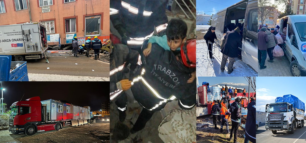 Kahramanmaraş’ta meydana gelen ve 10 şehirde ağır tahribat yaratan depremin ardından tüm Türkiye’de ve Trabzon’da başlayan çalışmalar, depremin 5. gününde de hız kesmeden devam ediyor. Trabzon Valiliği Koordinasyonunda bölgeye yardımlar ulaştırılırken, Trabzon Büyükşehir Belediyesi de rutin çalışmalar dışında tüm araç ve personelini depremden etkilenen çeşitli şehirlere gönderdi.