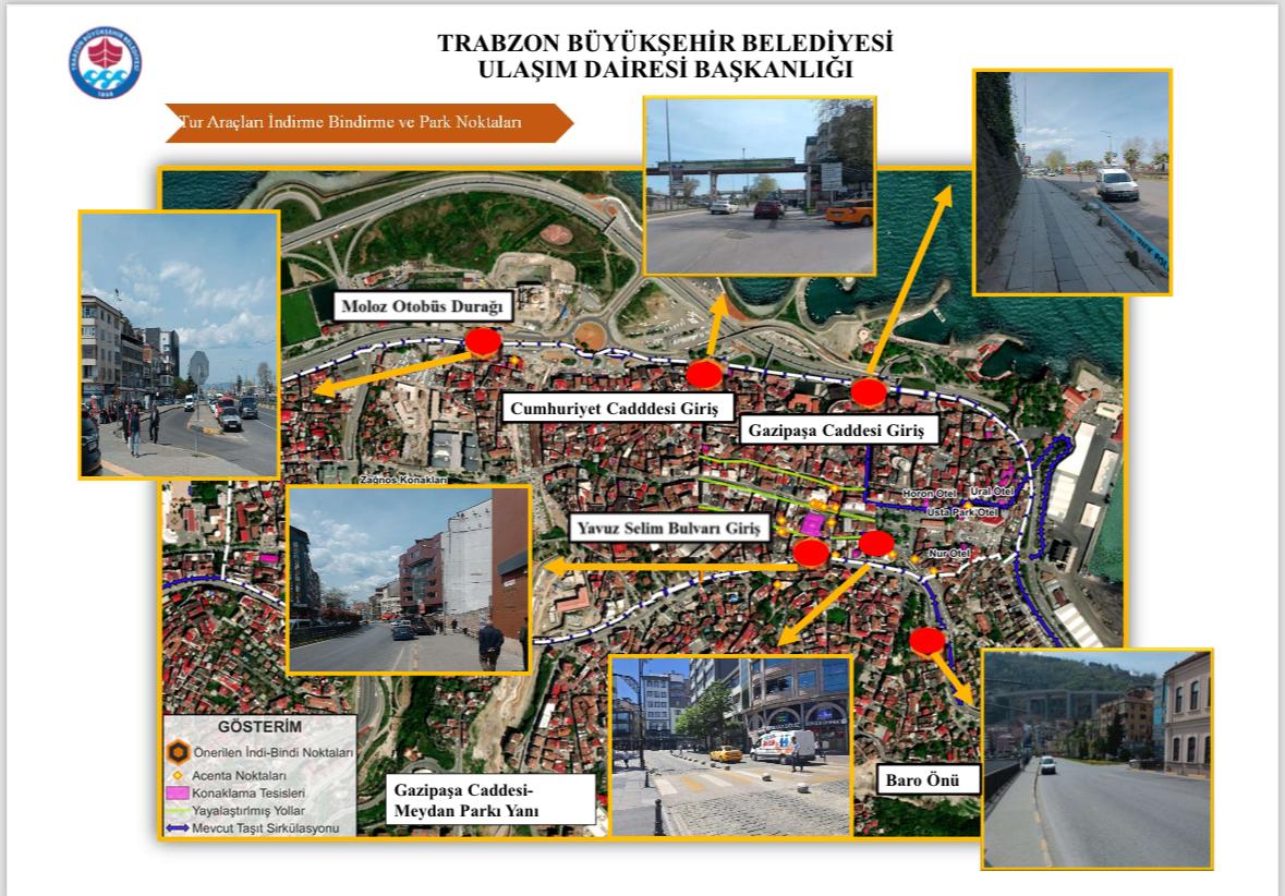Trabzon’da tur araçları için yolcu indirme-bindirme noktaları Ulaşım Trafik Komisyonu (UTK) tarafından alınan karar ile yürürlüğe girdi. Karar doğrultusunda bu noktalar Moloz Otobüs Durağı, Cumhuriyet Caddesi girişi, Gazipaşa Caddesi girişi, Yavuz Selim Bulvarı girişi ve Gazipaşa Caddesi Meydan Parkı yanı ile Baro önü olarak kararlaştırıldı. Gazipaşa Caddesi Meydan Parkı yanındaki durak noktası için özel bir düzenleme yapıldı. Bu noktada tur araçlarının kullanım saatleri sabah 10:30'dan önce ve akşam 18:30'dan sonra olarak belirlendi. Ancak, havaalanı-otel ve otel-havaalanı transferi olan yolcular için (D2 transfer yolcu listesi ibrazı ile) bu saat sınırlaması uygulanmayacak. Bu saatler dışında yapılan indirme ve bindirme işlemleri kolluk kuvvetleri tarafından denetlenecek.