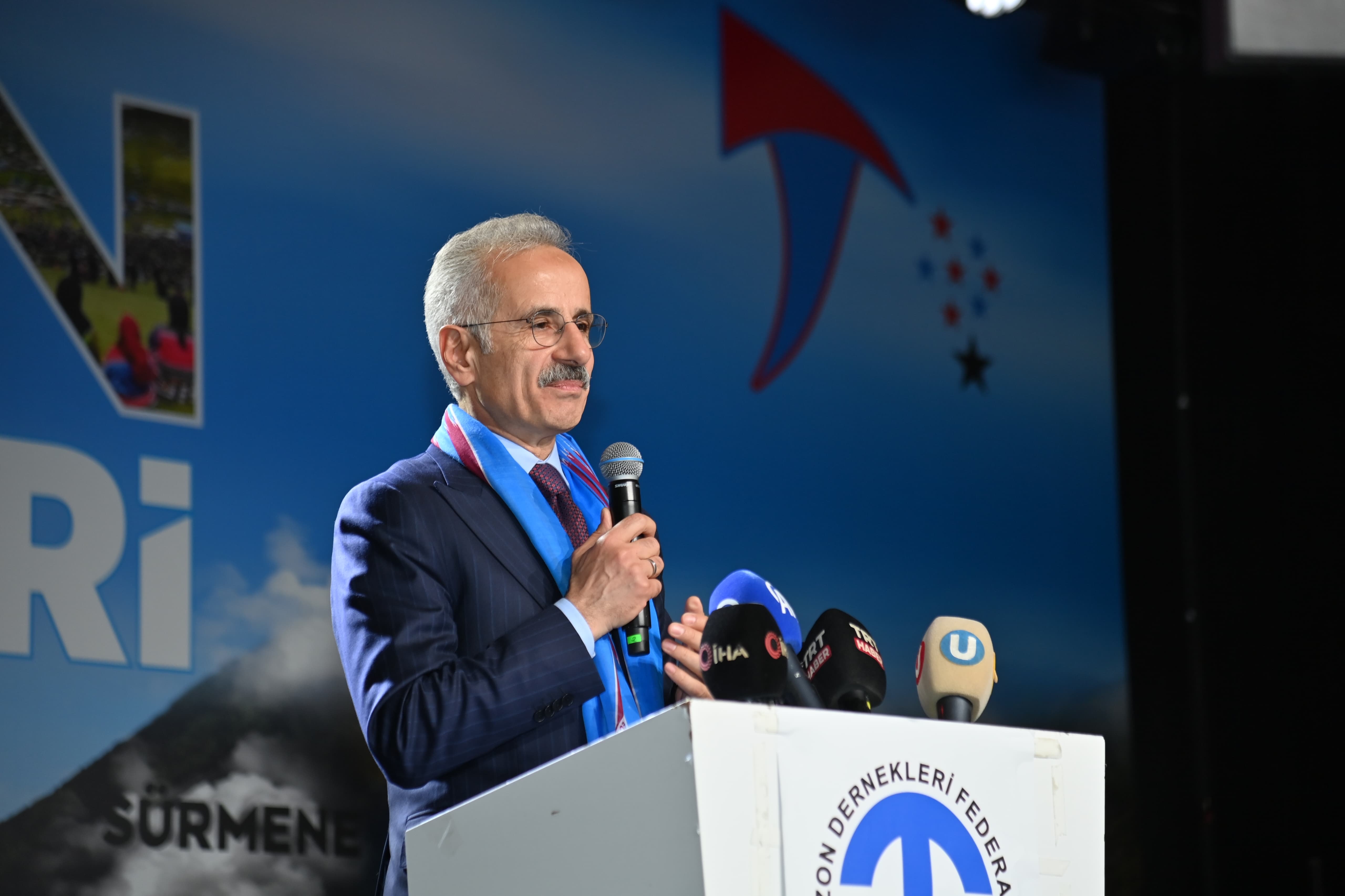 Ulaştırma ve Altyapı Bakanı Abdulkadir Uraloğlu, “Trabzon, sadece bir şehir değil; bir ruhtur, bir sevdadır, bir duruştur. Tarih boyunca vatan sevgisinin, cesaretin ve fedakarlığın sembolü olmuştur. Gazi Mustafa Kemal Atatürk’ün “Trabzon, fedakarlığın adıdır” dediği bu eşsiz ruh, 101 yıl sonra İstiklal Madalyası ile taçlandırılmıştır. Geçen yıl Meclis Başkanımız Sayın Numan Kurtulmuş ve Milli Savunma Bakanımız Sayın Yaşar Güler’in katılımıyla gerçekleşen tören, hepimizin göğsünü kabartmıştır. Bu madalya, yalnızca bir loncaya değil, topyekun Trabzon halkının vatanperverliğine adanmıştır. Bu gurur hepimizin gururudur. “Doğduğun yer değil, doyduğun yer” derler ya… Biz doyduğumuz yerde de doğduğumuz yeri hiç unutmadık. Trabzon’u tanıttık, Trabzonluyu sevdirdik. Nerede olursak olalım, içimizde bitmeyen bir Karadeniz inadı, bir memleket özlemi taşıdık. Trabzon’umuzu daha güçlü ve refah dolu bir geleceğe taşımak için çalıştık. Bu ruhla, Cumhurbaşkanımız Sayın Recep Tayyip Erdoğan’ın liderliğinde, Trabzon’umuzda ulaşım ve iletişim alanında birçok hizmeti hayata geçirdik. Avrupa’nın en uzun çift tüplü karayolu tüneli Zigana Tüneli’ni inşa ettik. Şehir içi trafiğine nefes aldıracak Kanuni Bulvarı’nda sona yaklaştık. Trabzon Güney Çevre Yolu’muzu da iki kesim halinde hayata geçiriyoruz. Birinci etabında çalışmalar tüm hızıyla sürüyor. Hem şehrimizi modern bir kent içi raylı sistemle donatacak hem de hızlı tren ile tanıştıracak dev projelerimiz, Sayın Cumhurbaşkanımızın vizyonuyla hayata geçiyor. Trabzon ile Samsun arasını 2 saate düşürecek Samsun-Trabzon-Sarp hızlı tren demiryolu projemiz ile Samsun’dan itibaren; Ordu, Giresun, Trabzon, Rize ve Artvin olmak üzere tüm kentlerimizi birbirine bağlamış olacağız. Yapım çalışmalarına da Kırıkkale-Çorum arasında başladık. Bu sene devamını da ihale edeceğiz. Trabzon Büyükşehir Belediyemizle birlikte hayata geçirdiğimiz Trabzon Hafif Raylı Sistem Hattımızın Akyazı-Havalimanı arasındaki 16,2 km uzunluğundaki 1.etabınının yapım ihalesine de önümüzdeki günlerde çıkacak ve inşa çalışmalarımıza başlayacağız. Yeni Trabzon Havalimanı'nı da 10 milyon yolcu kapasiteli terminal binası ve 3 bin metrelik pistiyle büyük gövdeli uçakların inebileceği şekilde tasarladık. Şimdi yeni projemiz kapsamında mevcut pistten biraz daha kuzeye denizde yeni havalimanımızı inşa edeceğiz. Yatırım programına aldık, ihalesini yaptık, yer teslimi yaptık. Yakın zamanda temeli atıp yapım çalışmalarına başlayacağız. Trabzon kalkınırsa Karadeniz yükselir, Karadeniz yükselirse Türkiye güçlenir” dedi.