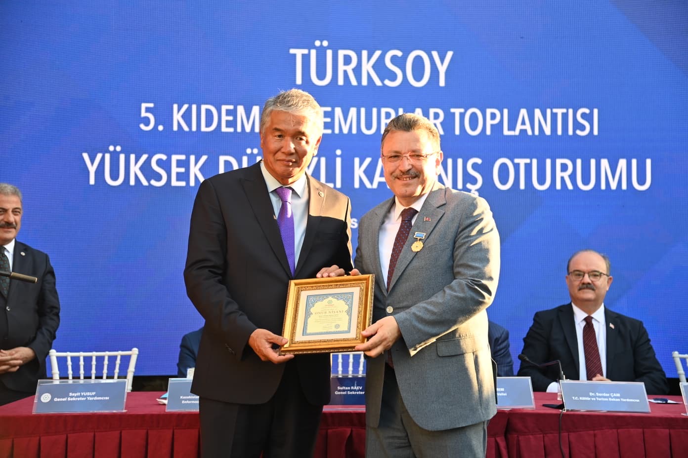 TÜRKSOY 5. Kıdemli Memurlar Toplantısı Yüksek Düzeyli Kapanış Oturumu’na katılan Trabzon Büyükşehir Belediye Başkanı Ahmet Metin Genç’e, destek ve katkılarından dolayı altın onur nişanı ve plaket takdim edildi. Başkan Genç, Trabzon’un Türk dünyasıyla kültürel bağlarını daha da güçlendirmek için çalıştıklarını belirterek, “Hedefimiz, Trabzon’u Türk dünyasının kültür başkenti haline getirmektir” ifadelerini kullandı.