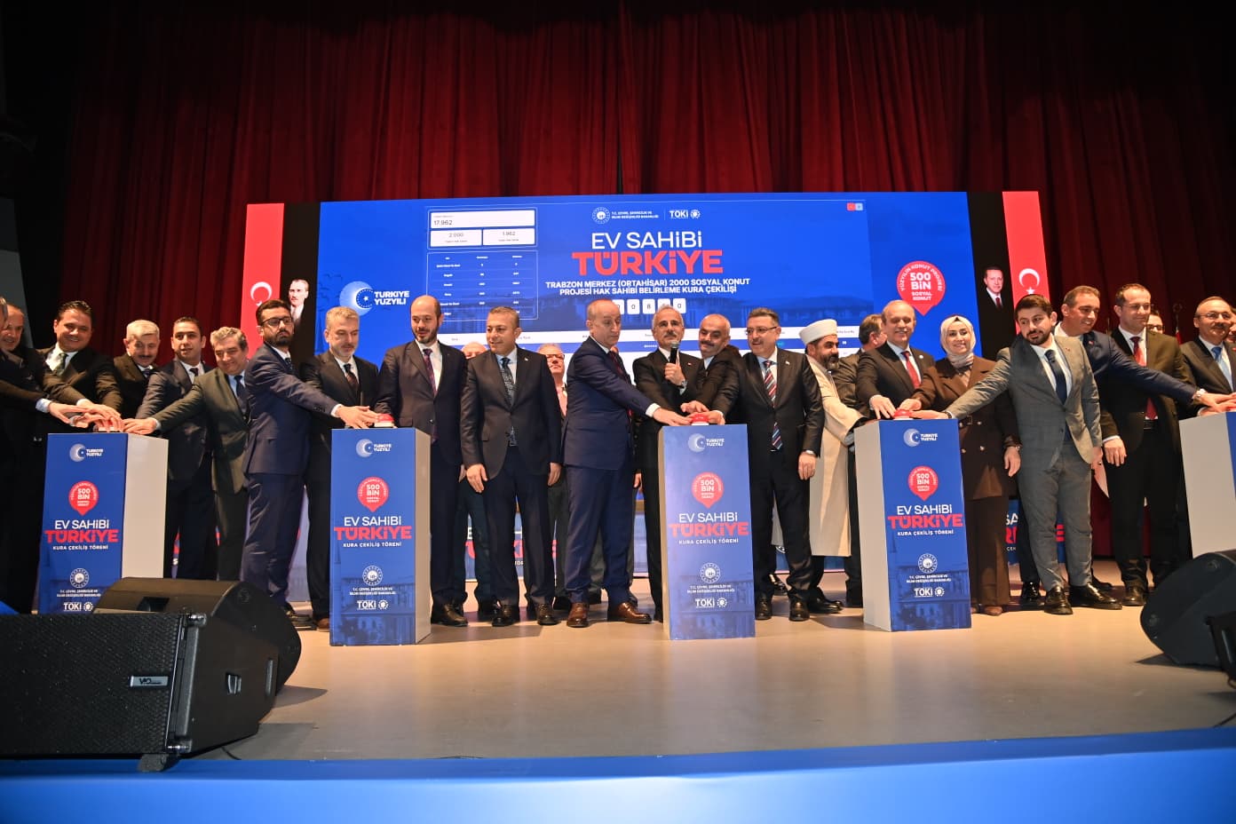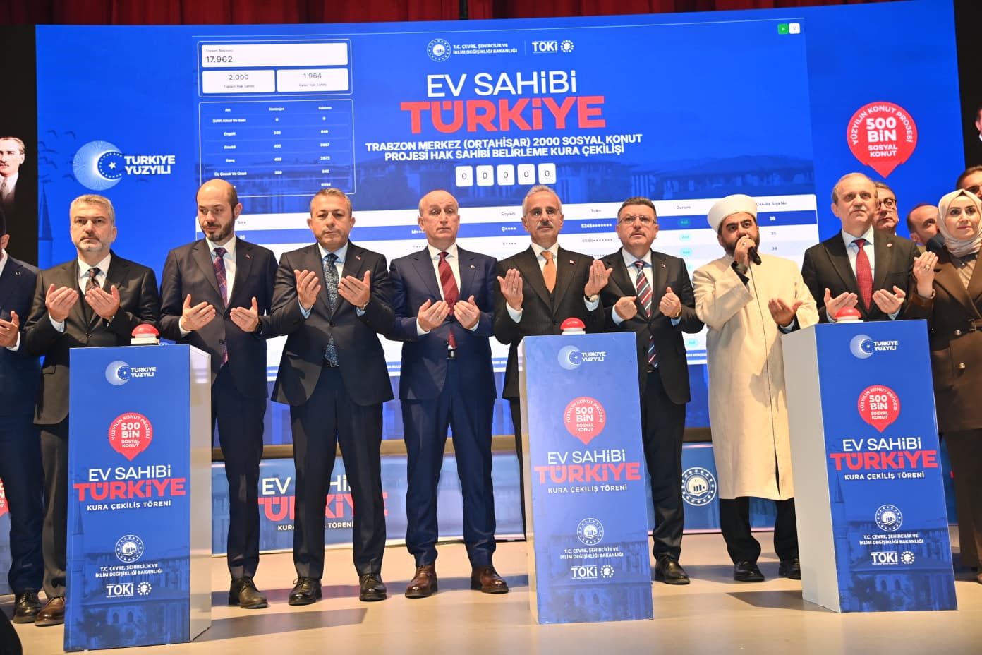Türkiye’nin 81 ilinde 500 bin sosyal konutun inşa edileceği 'Yüzyılın Konut Projesi' çerçevesinde Çevre, Şehircilik ve İklim Değişikliği Bakanlığı tarafından Trabzon’da yapılacak 3 bin 734 sosyal konut için kura çekiliş programı düzenlendi. Bakanlığa bağlı Toplu Konut İdaresi (TOKİ) tarafından yaptırılacak konutlar için gerçekleştirilen ve ev sahipliğini Trabzon Büyükşehir Belediye Başkanı Ahmet Metin Genç'in yaptığı kura çekiliş törenine, Ulaştırma ve Altyapı Bakanı Abdulkadir Uraloğlu, Çevre, Şehircilik ve İklim Değişikliği Bakanlığı Bakan Yardımcısı Ömer Bulut, Trabzon Valisi Tahir Şahin, TOKİ Başkanı Mustafa Levent Sungur, TOKİ Başkan Yardımcısı Murat Aydın, AK Parti Trabzon İl Başkanı Sezgin Mumcu, kent protokolü, ilçe belediye başkanları, siyasi parti ve sivil toplum kuruluşu temsilcileri ile sosyal konut başvurusunda bulunan çok sayıda vatandaş katıldı.