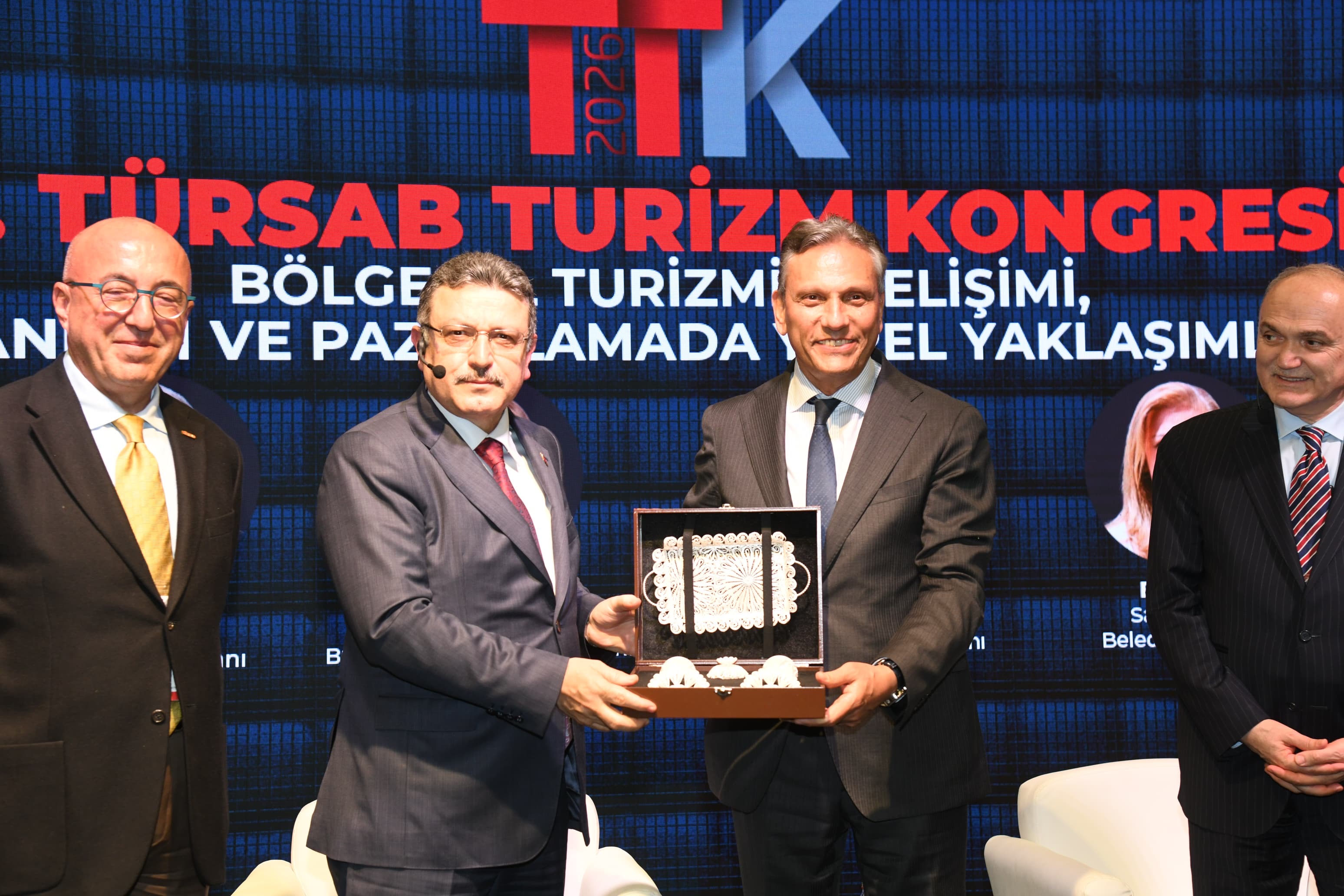 Başkan Genç konuşmasını şu sözlerle tamamladı: “Trabzon’un markalaşma sürecinde coğrafi işaretli ürünler de önemli bir yer tutuyor. Şehrimizde 15-16 civarında coğrafi işaretli ürün bulunmaktadır. Bunlardan biri olan hasır bilezik ve kazaziye gibi el sanatları, Anadolu’da yalnızca Trabzon ve Mardin’de görülen özel işçilik örnekleridir. Bu ürünleri 'Tuğra' markası altında toplayarak markalaştırma sürecini başlattık. Aynı zamanda bu marka, 'kadının sesi' anlamını da taşımaktadır. Bu süreçte kadınlarımızla birlikte kooperatifleşmeye gittik. Kooperatif dışında üretim yapan kadınlarımızın ürünlerini de satın alarak destekliyoruz. Çünkü üretimin gücüne inanıyoruz. Günümüzde kalkınmanın temelinde üretim, yatırım, istihdam ve ihracat yer almaktadır. Ne kadar üretirsek, o kadar güçlü oluruz. Sözlerimi tamamlarken, bu organizasyonda emeği geçen herkese teşekkür ediyorum. Ayrıca önümüzdeki yıl bu önemli organizasyonu Trabzon’da gerçekleştirmekten büyük memnuniyet duyacağımızı ifade etmek isterim.” Başkan Genç, program sonunda TÜRSAB Başkanı Firuz Bağlıkaya’ya hediye takdim etti.