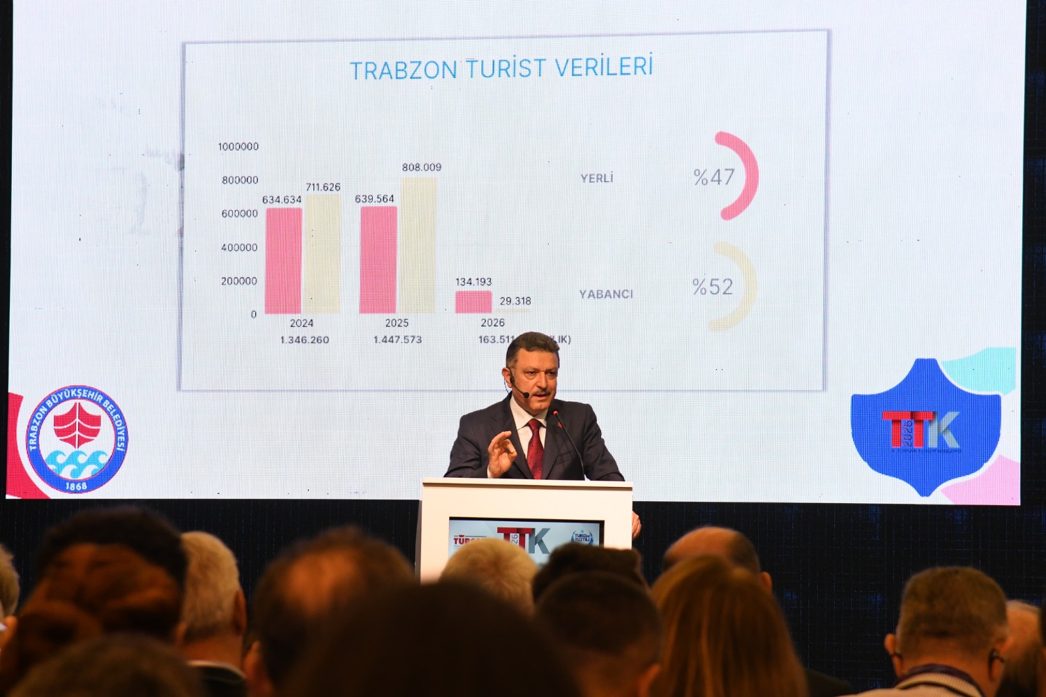 Başkan Genç konuşmasını şu sözlerle sürdürdü: “Trabzon’a gelen turistlerin yaklaşık yüzde 40’ı Suudi Arabistan ve Körfez ülkelerinden geliyor. Yapılan anketlerde bu ziyaretçilerin Trabzon’u tercih etmesinin üç temel nedeni öne çıkıyor: güvenli bir şehir olması, ezan sesinin sosyal yaşamın bir parçası olması ve Türkiye’ye, özellikle Cumhurbaşkanımız Sayın Recep Tayyip Erdoğan’a duyulan güven. Bu da gösteriyor ki bir ülkenin algısı en az doğal güzellikleri kadar önemli. Biz de bu güçlü yönlerimizi daha da artırarak yolumuza devam ediyoruz. Trabzon’da turizm ciddi bir yükseliş trendinde. Ancak bu noktada profesyonel desteklere de ihtiyaç duyuyoruz. Bu vesileyle, gelecek TÜRSAB Turizm Kongresi’ne Trabzon olarak ev sahipliği yapmaya hazır olduğumuzu da ifade etmek isterim. 2026 yılının ilk üç ayına ait veriler, bölgedeki savaşların etkisiyle bir miktar düşüş gösterdi. Buna rağmen Turizm Master Planımızı, bakanlığımızın öngördüğü disiplin çerçevesinde profesyonel bir şekilde hazırlıyoruz. Artık sadece turist getirmek yetmez; onları şehirde daha uzun süre tutacak nedenler oluşturmak gerekiyor. Trabzon’un 4 bin yıllık tarihi, doğal güzellikleri elbette önemli; ancak asıl mesele kalma süresini artırmaktır. Özellikle Körfez ülkelerinden gelen ziyaretçiler genellikle kalabalık ve aile odaklı seyahat ediyor. Bu nedenle onların şehirde daha fazla vakit geçirebileceği alanlar oluşturuyoruz. Bu kapsamda Trabzon Kalesi’nde 198 metre derinliğinde, 16 metre uzunluğunda bir tünel açarak içerisine akvaryum kazandırdık. Bu proje büyük ilgi gördü ve çok sayıda yabancı ziyaretçi çekti. Bunun yanı sıra seyir terasları ve sahil düzenlemeleri gibi projelerle Trabzon’un cazibesini artırmaya devam ediyoruz.”
