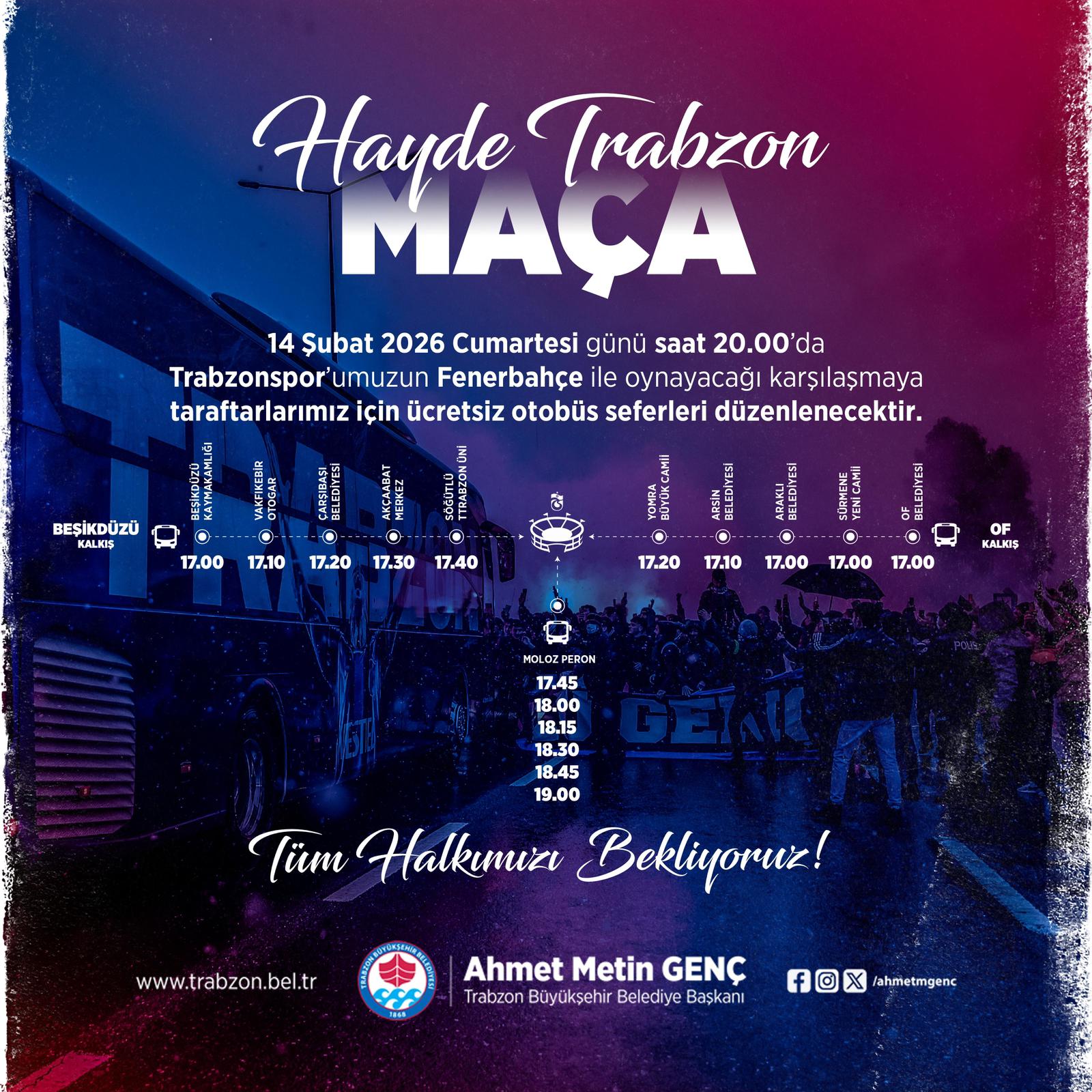 Trabzon Büyükşehir Belediyesi, yarın akşam Akyazı Stadı’nda oynanacak Trabzonspor-Fenerbahçe Trendyol Süper Lig karşılaşması için taraftarların stadyuma ulaşımını kolaylaştırmak amacıyla ücretsiz otobüs seferleri düzenleyecek. Saat 20.00’da başlayacak maç öncesinde ulaşımda aksama yaşanmaması için batı ve doğu ilçelerinden seferler düzenlenecek. Belediye otobüsleri, Beşikdüzü Kaymakamlığı önünden 18.30, Vakfıkebir Otogarı’ndan 17.10, Çarşıbaşı Belediyesi önünden 17.20, Akçaabat merkezden 17.30 ve Söğütlü Trabzon Üniversitesi önünden 17.40 saatlerinde hareket edecek. Doğu ilçelerinden ise Of Belediyesi önü, Sürmene Yeni Cami mevkii ve Araklı Belediyesi önünden saat 17.00'de, Arsin Belediyesi önünden saat 17.10'da, Yomra Büyük Cami önünden saat 17.20’de seferler düzenlenecek. Ayrıca Moloz peronundan da 17.45, 18.00, 18.15, 18.30, 18.45 ve 19.00 saatlerinde ek otobüs seferleri gerçekleştirilecek.