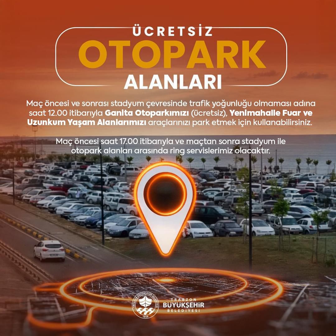 Trabzon Büyükşehir Belediyesi, maç öncesi ve sonrası stadyum çevresinde trafik yoğunluğunun önüne geçmek amacıyla saat 12.00 itibarıyla Ganita Otoparkı’nı ücretsiz olarak taraftarların hizmetine sunacak. Ayrıca Yenimahalle Fuar Alanı ve Uzunkum Yaşam Alanı da araç park alanı olarak kullanılabilecek. Otopark alanları ile stadyum arasında maç öncesinde saat 17.00'de ve maç sonrasında ring servisleri düzenlenerek taraftarların ulaşımı kolaylaştırılacak. Trabzon Büyükşehir Belediyesi’nden yapılan açıklamada, “Amacımız, Trabzonspor’umuza gönül veren tüm taraftarlarımızın müsabakayı coşku ve heyecan içinde takip edebilmesi için ulaşımı sorunsuz hale getirmektir” denildi.