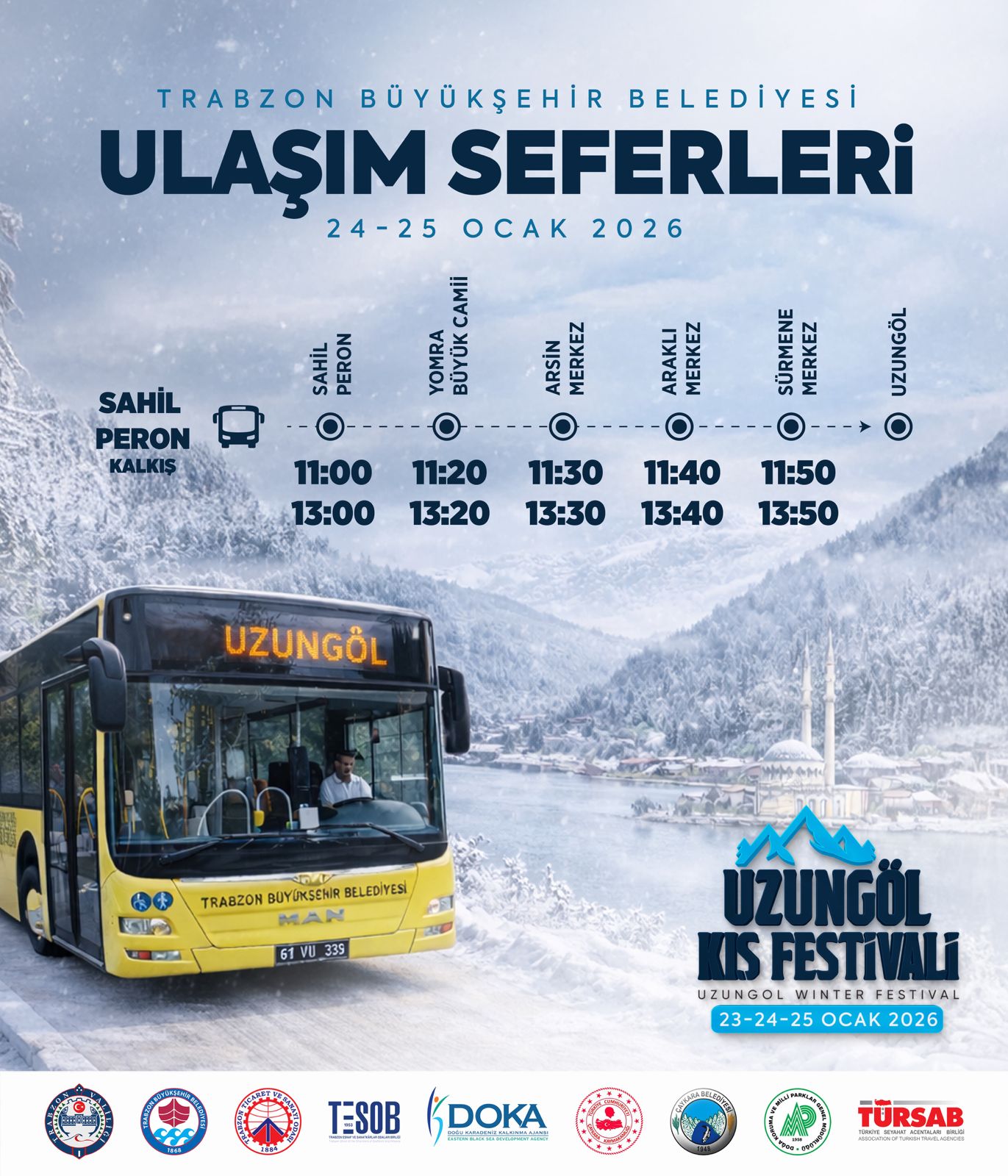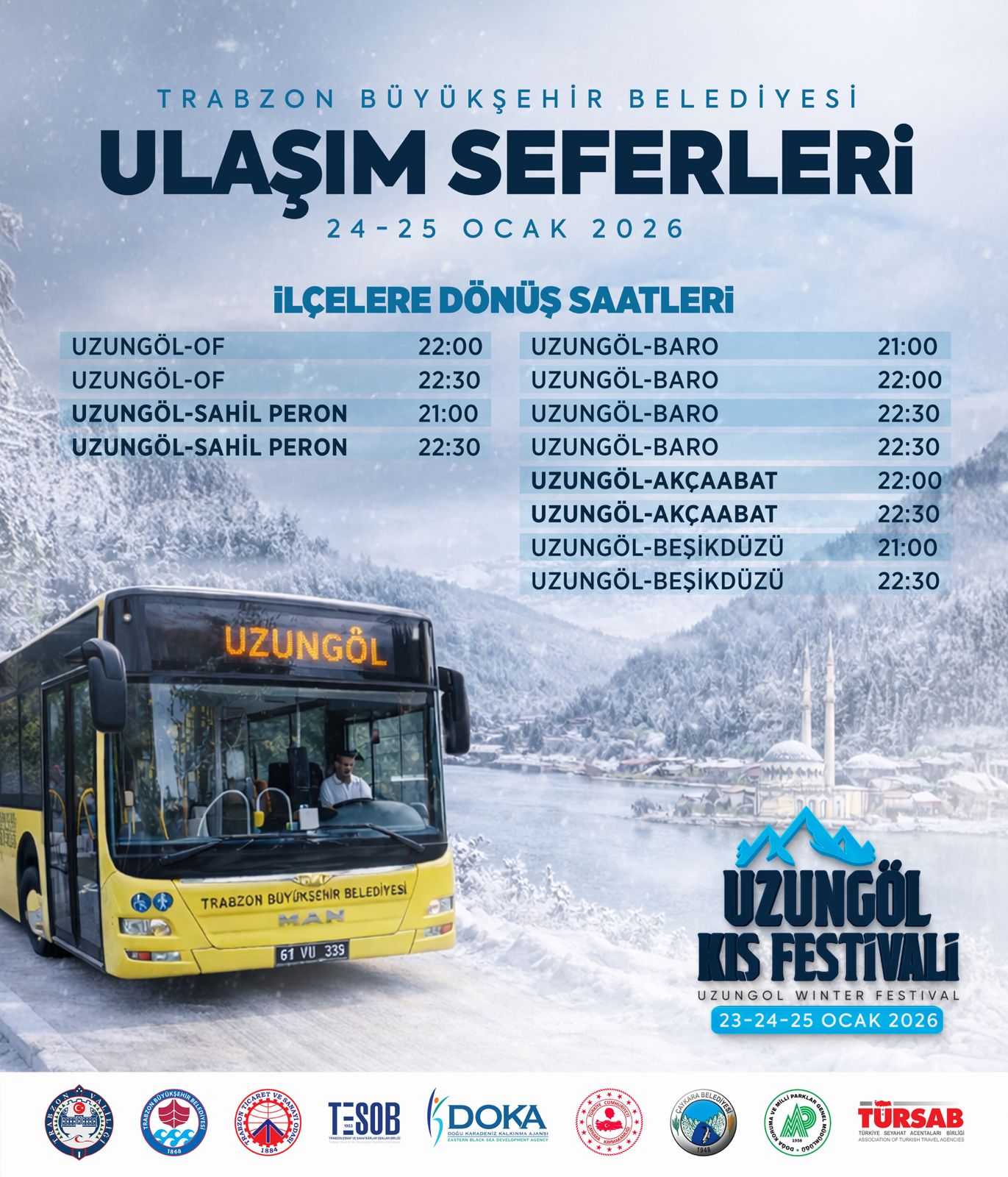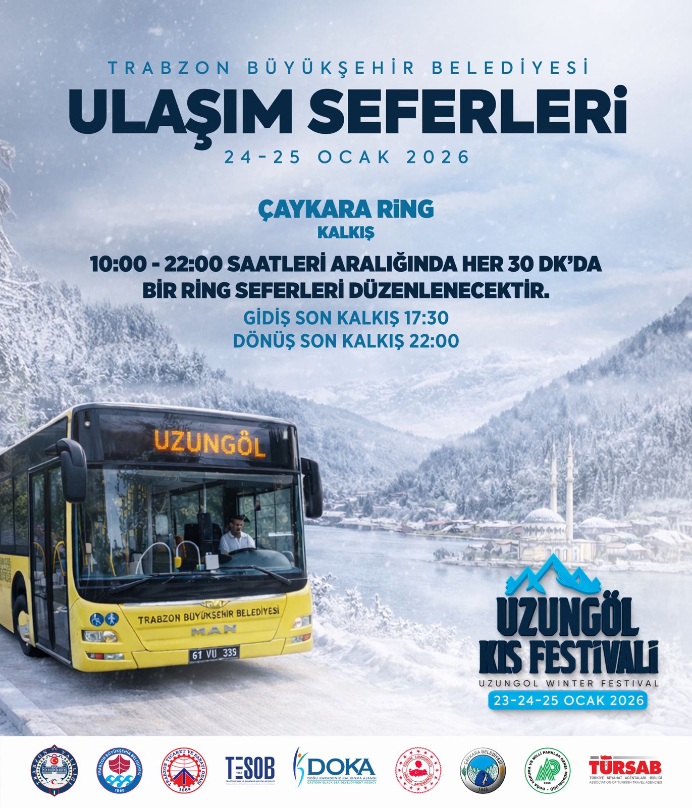 Trabzon Büyükşehir Belediyesi iş birliğinde, bu yıl ilki düzenlenecek "Uzungöl Kış Festivali" 23-25 Ocak tarihleri arasında gerçekleştirilecek. Büyükşehir Belediyesi, festivale katılmak isteyen vatandaşların ulaşımını kolaylaştırmak amacıyla 24 ve 25 Ocak günlerinde ücretsiz otobüs seferleri düzenleyecek.