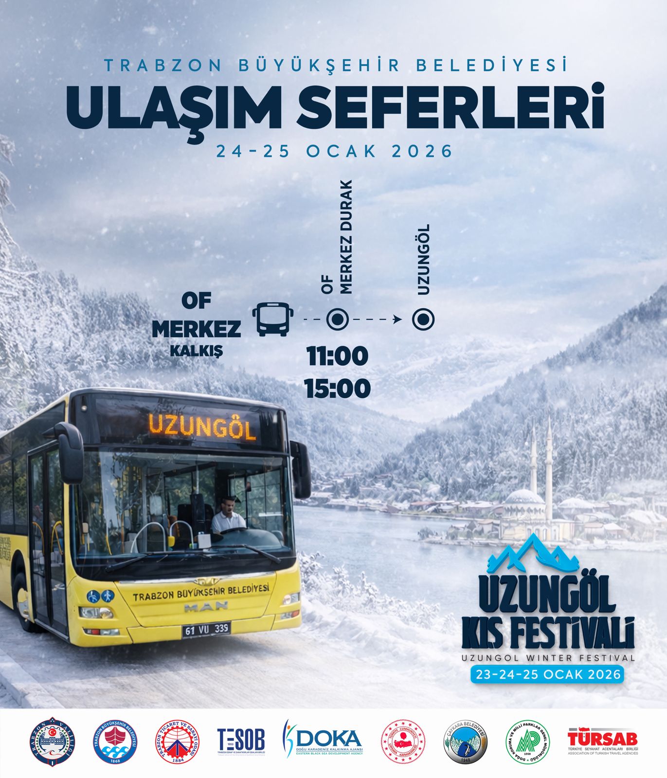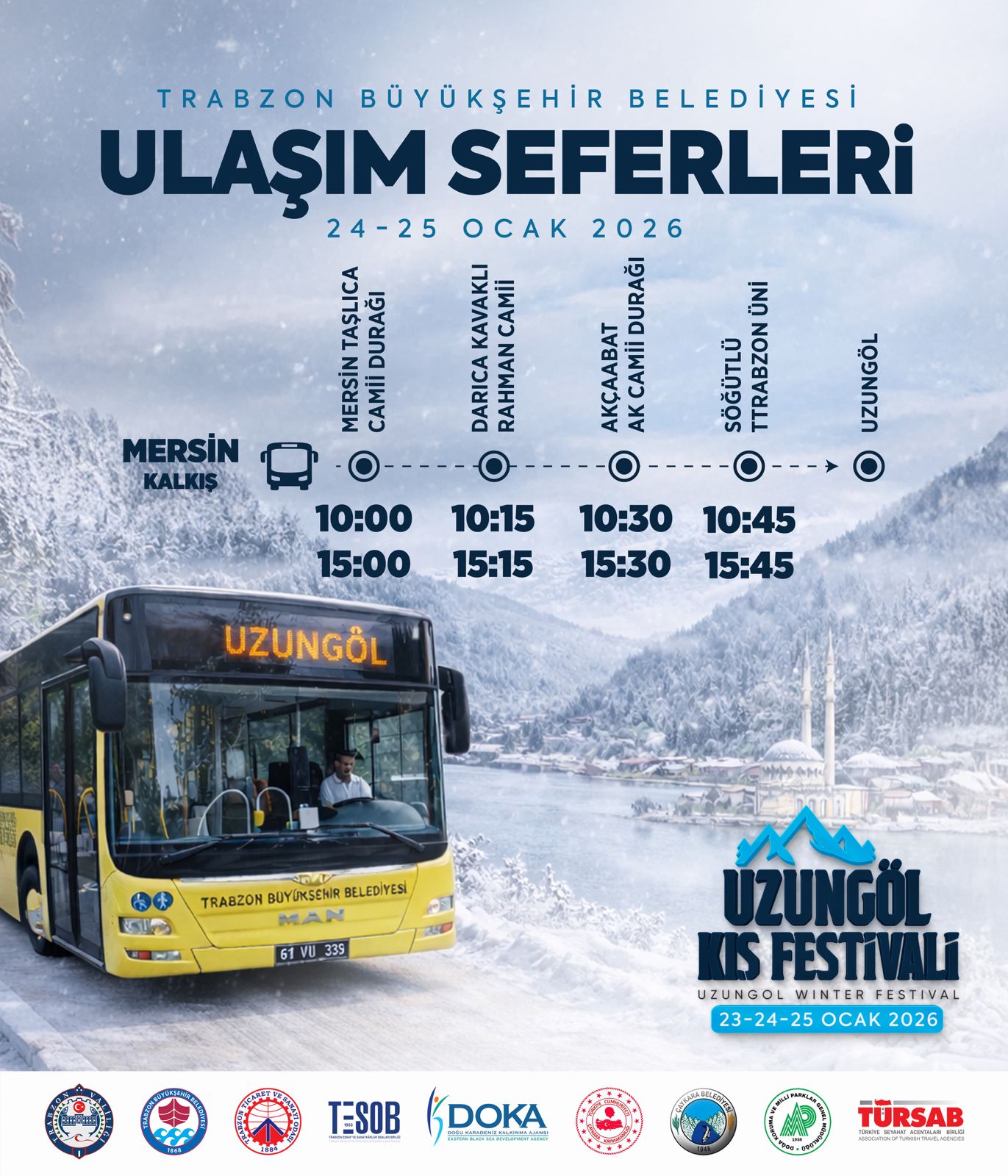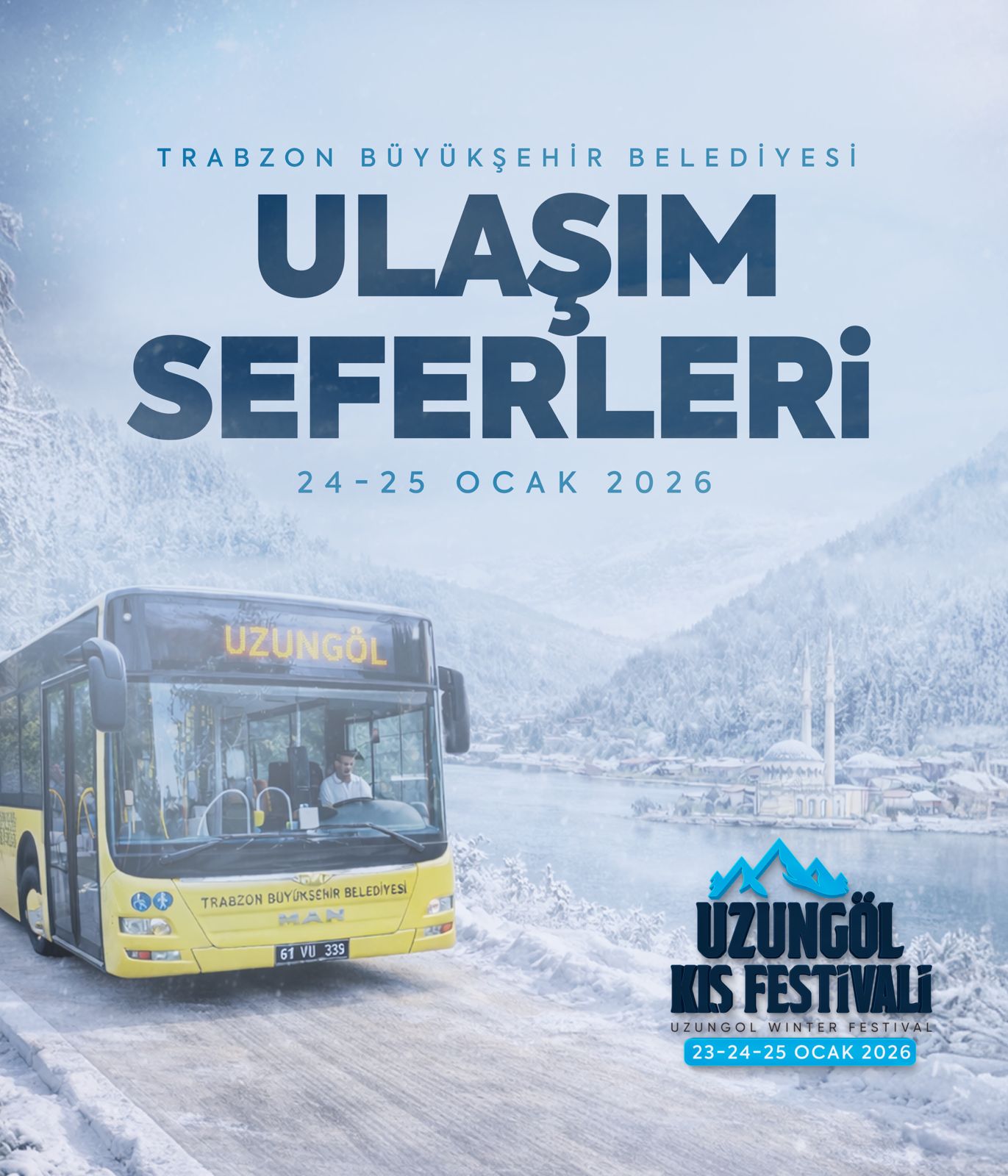 Trabzon Büyükşehir Belediyesi iş birliğinde, bu yıl ilki düzenlenecek "Uzungöl Kış Festivali" 23-25 Ocak tarihleri arasında gerçekleştirilecek. Büyükşehir Belediyesi, festivale katılmak isteyen vatandaşların ulaşımını kolaylaştırmak amacıyla 24 ve 25 Ocak günlerinde ücretsiz otobüs seferleri düzenleyecek.