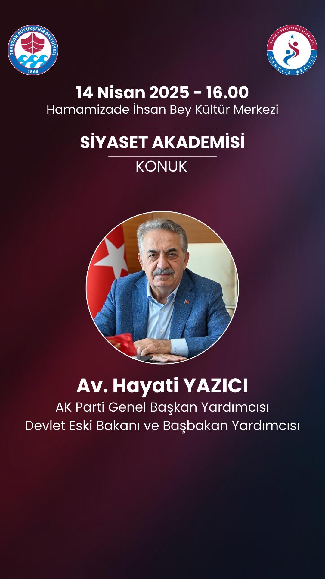 AK Parti Genel Başkan Yardımcısı ve geçmiş dönem Devlet Bakanı Hayati Yazıcı, Trabzon Büyükşehir Belediyesi Gençlik Meclisi tarafından düzenlenen Gençlik Akademileri’nin konuğu olacak. Yazıcı, 14 Nisan’da (yarın) gençlerle bir araya gelerek siyaset ve kamu yönetimi üzerine tecrübelerini paylaşacak.