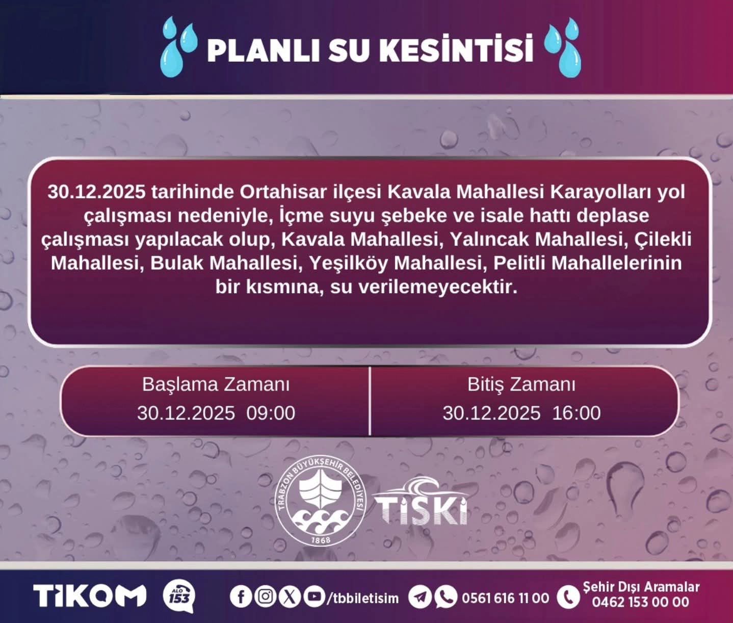 TİSKİ Genel Müdürlüğü'nden yapılan açıklamada, "Yol çalışması kapsamında içme suyu şebeke ve isale hattında deplase çalışması gerçekleştirileceğinden; Ortahisar ilçemize bağlı Kavala, Yalıncak, Çilekli, Bulak, Yeşilköy ve Pelitli mahallelerimizin bir kısmına 30 Aralık 2025 Salı günü 09.00 ile 16.00 saatleri arasında su verilemeyecektir. Bu mahallelerde ikamet eden vatandaşlarımızın, mağduriyet yaşamamaları için gerekli tedbirleri almaları rica olunur. Kesintinin zorunlu olduğunu bir kez daha vurgulayarak anlayışları için vatandaşlarımıza teşekkür ediyoruz" denildi.
