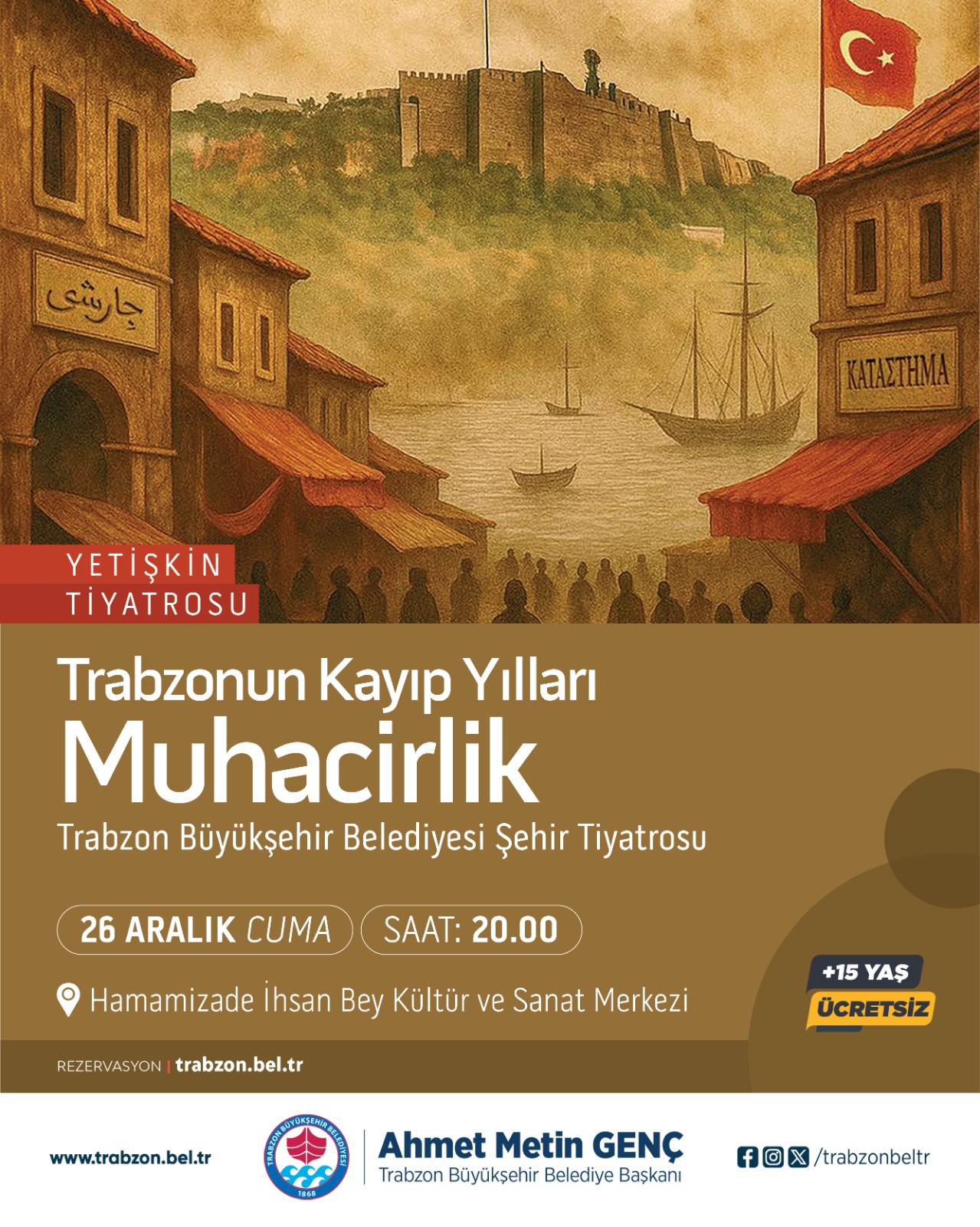 Trabzon Büyükşehir Belediyesi, Aralık ayında zengin bir kültür ve sanat programı sunuyor. Tiyatro oyunları, konserler, paneller ve söyleşiler, Hamamizade İhsan Bey Kültür ve Sanat Merkezi’nde izleyiciyle buluşacak. Büyükşehir Belediye Başkanı Ahmet Metin Genç, her yaştan vatandaşın ilgisini çekecek etkinliklere tüm Trabzonluları davet etti.
