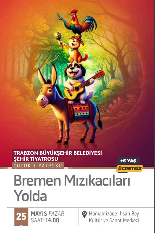 Trabzon Büyükşehir Belediyesi, kültür ve sanat etkinliklerine Mayıs ayında da devam ediyor. Kültür ve Sosyal İşler Dairesi Başkanlığı tarafından organize edilen etkinlikler kapsamında tiyatrodan çocuk sinemasına, söyleşilerden sergilere kadar birbirinden renkli kültür-sanat faaliyetleri sanatseverleri buluşturacak. Etkinlikler kapsamında, 2 Mayıs Cuma günü saat 20.00’de Trabzon Sanat Tiyatrosu tarafından “Kayıp Yıldız” adlı oyun Hamamizade İhsan Bey Kültür ve Sanat Merkezi’nde sahnelenecek. 4 Mayıs Pazar günü saat 14.00’te Trabzon Oda Tiyatrosu’nun çocuklara yönelik “Çizmeli Kedi” oyunu izleyiciyle buluşacak. 9 Mayıs Cuma akşamı saat 20.00’de “Şahitler” adlı tiyatro gösterisi sahnelenecek. 10 Mayıs Cumartesi günü saat 14.00’te çocuklara yönelik “Eşek Ayısı” oyunu, 11 Mayıs Pazar günü ise yine saat 14.00’te “Bay Mikrop” adlı tiyatro oyunu sahnede olacak. 16 Mayıs Cuma akşamı saat 20.00’de Trabzon Sanatevi tarafından “Aile Familyası” adlı oyun sahnelenecek. 17 Mayıs Cumartesi saat 14.00’te geleneksel Türk gölge oyunu “Hacivat-Karagöz” izleyiciyle buluşacak. 18 Mayıs Pazar günü saat 14.00’te ise “Boğaç Han” adlı çocuk sineması gösterimi yapılacak. 23 Mayıs Cuma akşamı saat 20.00’de Trabzon Büyükşehir Belediyesi Şehir Tiyatrosu tarafından sahnelenen “Şükran Trabzon” oyunu bir kez daha izleyiciyle buluşacak. 24 ve 25 Mayıs tarihlerinde, Cumartesi ve Pazar günleri saat 14.00’te çocuklara yönelik “Bremen Mızıkacıları Yolda” adlı tiyatro oyunu sahnelenecek. Mayıs ayı etkinlikleri, 30 Mayıs Cuma günü saat 20.00’de sahnelenecek “Koleksiyoncu” adlı oyun ve 31 Mayıs Cumartesi saat 14.00’te yeniden sahnelenecek “Çizmeli Kedi” oyunu ile sona erecek.