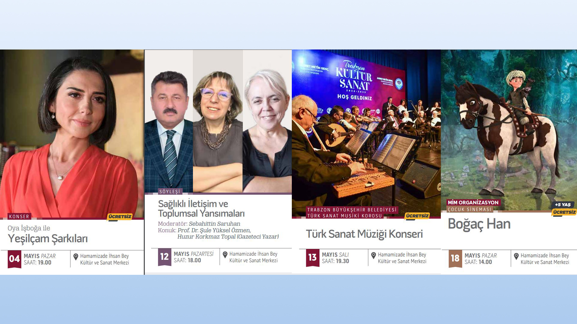 Trabzon’da Mayıs ayı boyunca çeşitli kurum ve derneklerin katkısıyla düzenlenecek konser programları kapsamında, Türk sanat müziğinden halk müziğine uzanan birçok etkinlik müzikseverlerle buluşacak. 4 Mayıs Pazar akşamı saat 19.00’da Oya İşboğa’nın sahne alacağı “Yeşilçam Şarkıları” konseriyle program başlayacak. 7 Mayıs Çarşamba akşamı saat 19.30’da Trabzon Liselerinden Yetişenler Derneği tarafından Türk Sanat Müziği konseri düzenlenecek. 13 Mayıs Salı akşamı saat 19.30’da Trabzon Büyükşehir Belediyesi Türk Sanat Musiki Korosu sahne alacak. 14 Mayıs Çarşamba akşamı saat 19.30’da Tevfik Serdar Kültür Sanat Merkezi’nde Türk Sanat Müziği konseri gerçekleştirilecek. 26 Mayıs Pazartesi akşamı Trabzon Müzik ve Halk Oyunları Derneği tarafından Türk Sanat Müziği konseri verilecek. 27 Mayıs Salı akşamı saat 19.30’da Necdet Kaya, “En Sevilen Türküler” adlı konserle izleyicilerle buluşacak. Mayıs ayı konser programı, 28 Mayıs Çarşamba akşamı saat 19.30’da Trabzon Müzik Eğitim Merkezi Derneği tarafından verilecek Türk Halk Müziği konseriyle sona erecek.