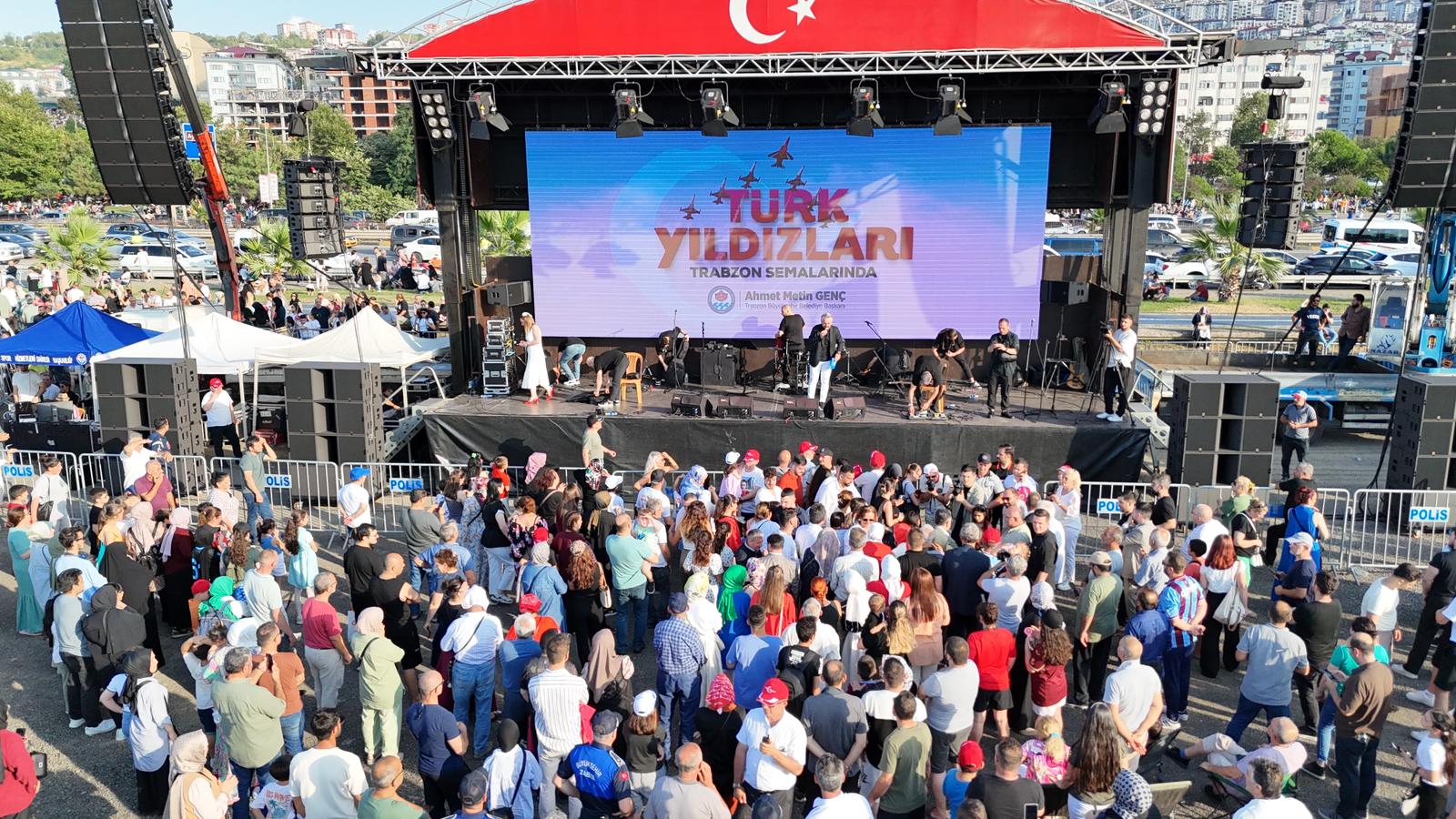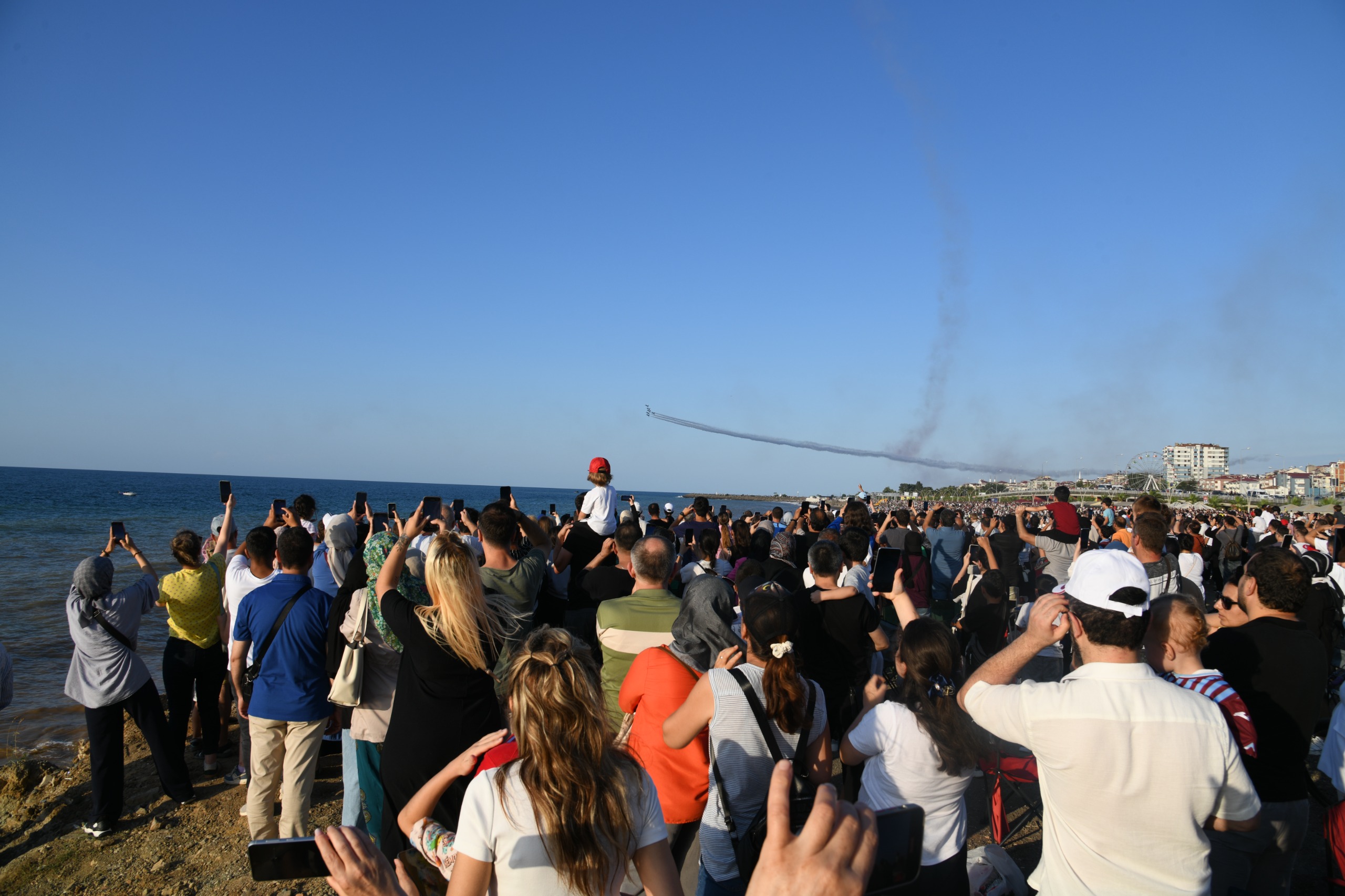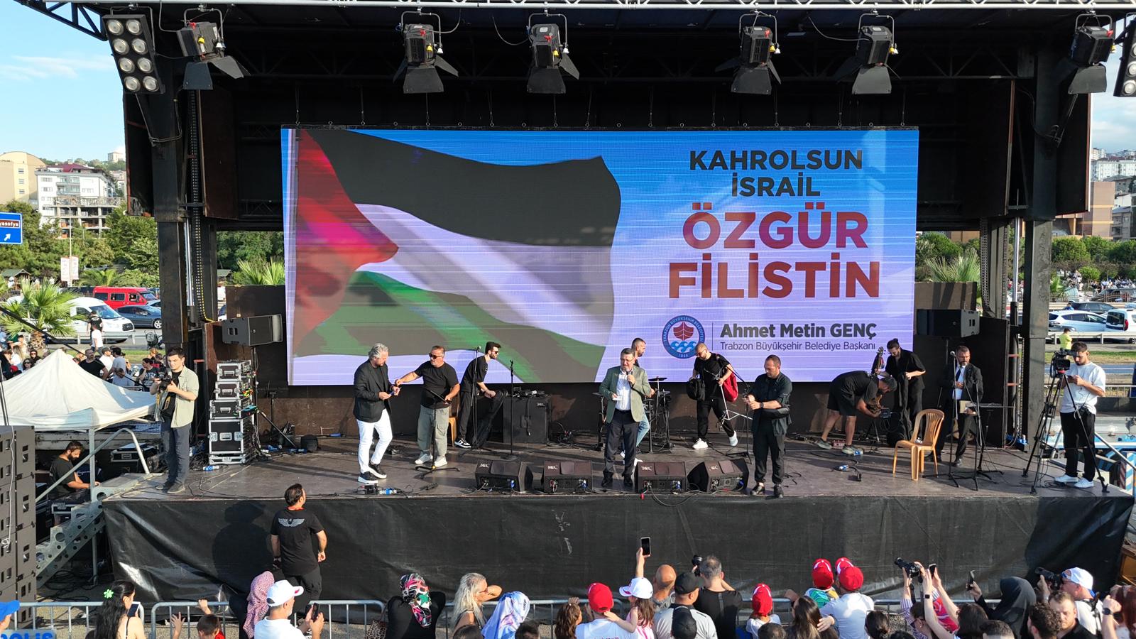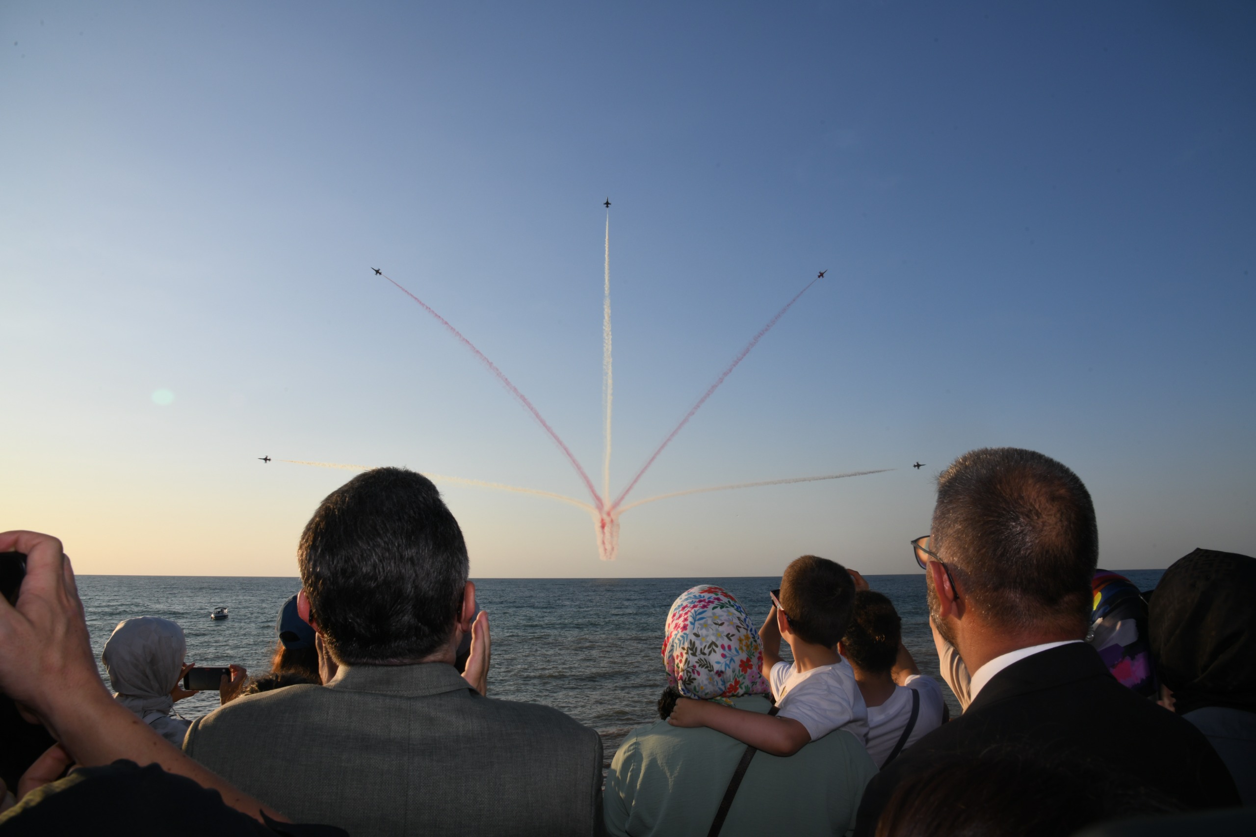 Başkan Genç, sözlerini şöyle tamamladı: “Bugün insanlık bizden bir mesaj bekliyor. Katil İsrail devleti, Gazze’de soykırım yapıyor. Çocukları ve kadınları öldürüyorlar. Çocuklar büyüyüp kendi topraklarını savunmasın, kadınlar çocuk doğurmasın diye katliam yapıyorlar. Bu, apaçık bir soykırımdır. Bu yüzden buradan, Trabzon’umuzdan, hep birlikte katil ve soykırımcı İsrail devletini şiddetle lanetliyor, kınıyoruz. Allah’ın gazabı onların üzerine olsun. Oradaki kardeşlerimiz için, bebekler için, anneler için, bir yudum suya ve bir lokma ekmeğe muhtaç olanlar için dua edeceğiz. Ama sadece dua etmekle kalmayacağız. Bugün bütün dünya suskun, maalesef Müslüman âlemi de suskun. Ancak ayağa kalkan bir Türkiye var. Haksızlığa karşı her platformda itirazını dile getiren, gür bir sesle haykıran bir liderimiz var: Recep Tayyip Erdoğan. İnşallah Cumhurbaşkanımızın çizdiği vizyonla, Gazze’deki mazlumun ve mağdurun sesi olmaya devam edeceğiz. Bunun için daha çok çalışacak, daha güçlü olacağız. Bu vesileyle, milli duygularımızı kabartan, gurur kaynağımız olan Türk Yıldızlarımıza, güzel Trabzon’umuza hoş geldiniz, sefalar getirdiniz, şeref verdiniz diyorum. Biliyorum ki böyle gururlu günlerde, Trabzonlular bizleri hiçbir zaman yalnız bırakmadı. Bu vesileyle Trabzon'un bir evladı olmaktan ve Trabzonlu olmaktan da bir kez daha gurur duyduğumu ifade etmek istiyorum.” Konuşmaların ardından Trabzon semalarında adeta görsel bir şölen sunan Türk Yıldızları, gerçekleştirdikleri nefes kesici manevralar ve gösteri uçuşlarıyla izleyenleri hayran bıraktı. Coşkulu kalabalık, gökyüzündeki akrobatik hareketleri alkış yağmuruna tuttu. Program Vira Cemal’in sahne performansıyla sona erdi.