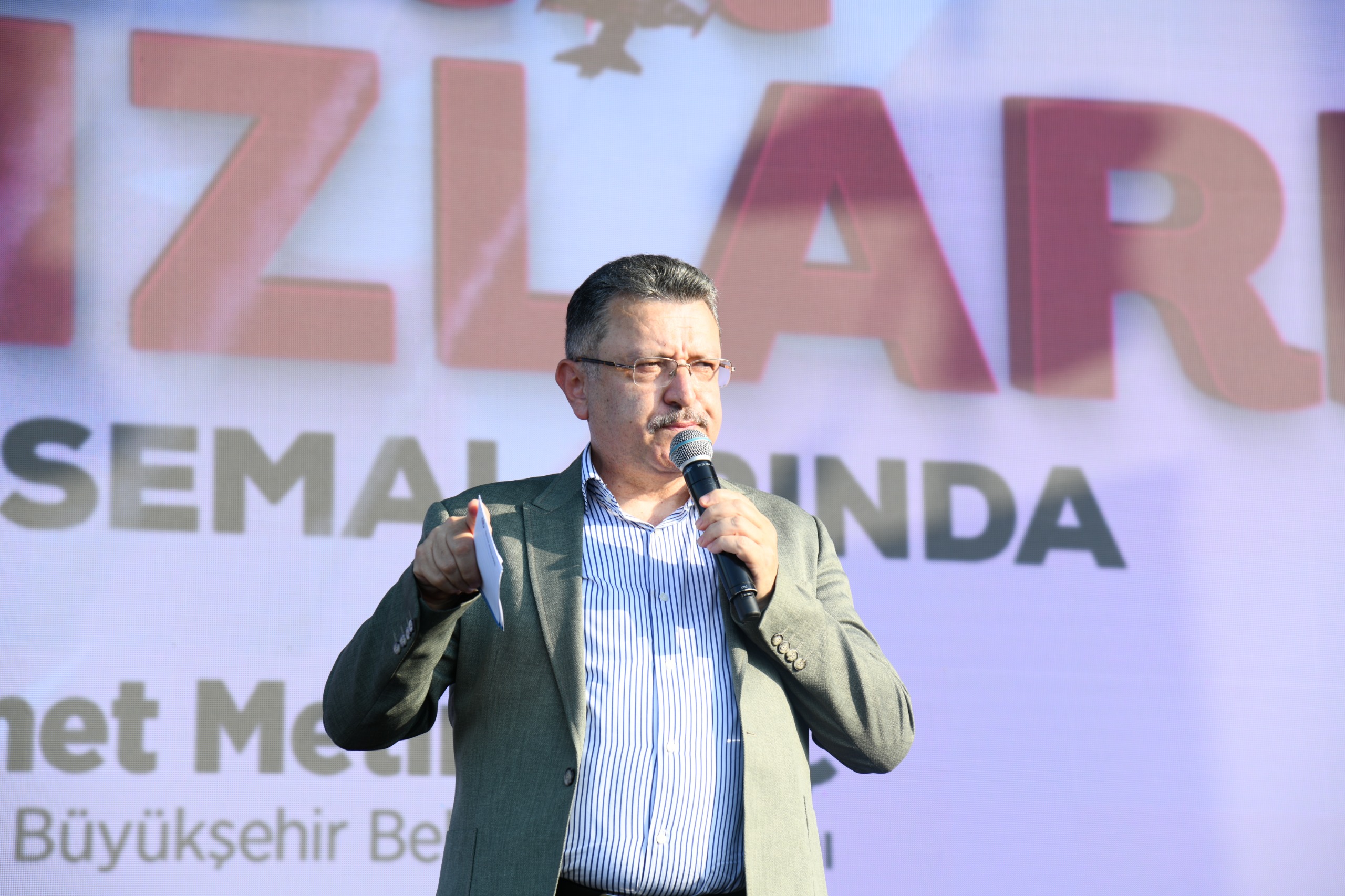 Başkan Genç, “Burak Gençcelep, Türk Yıldızları pilotumuzdu. Konya’da yaptığı bir eğitim uçuşu sırasında, fırlatma koltuğunu kullanarak hayatını kurtarma imkânı varken, uçağın kalabalık bir bölgeye düşmemesi için son ana kadar kontrolü bırakmadı. Şehrin üzerine düşüp daha fazla can kaybına yol açmaması için kendi hayatını feda etti. Basitçe söylemek gerekirse, fırlatma koltuğunu kullansaydı kurtulabilirdi. Ancak o, uçağı güvenli bir alana yönlendirmeyi seçti. Belki de onlarca insanın hayatını kurtardı. Bu fedakârlığı, vatanı ve insanı için canını gözünü kırpmadan veren bir kahraman oluşunun en büyük göstergesidir. Allah ona gani gani rahmet eylesin. İşte bugün, onun mesai arkadaşları olan Türk Yıldızlarımız, Burak Gençcelep anısına uçuyorlar. O artık aramızda değil, ama biz biliyoruz ki şehidimiz de onları selamlayacak; onlar da onu selamladılar, selamlayacaklar. Bizler de hep birlikte selam duruyoruz. Burada sadece bir Türk Yıldızları gösterisi izlemiyoruz. Aslında aynı zamanda Türkiye’nin havadaki gücünü izliyoruz. Çok şükür, bu alanda büyük mesafeler kat ettik. Türkler, tarih boyunca gökyüzüne meraklı olmuştur. Hezarfen Ahmed Çelebi’den başlayarak, Vecihi Hürkuş’un ilk uçağını yapmasına kadar uzanan bir geçmişimiz var. Bugün ise kendi savaş uçağını, kendi imkanlarımızla üretmeyi başarmış bir milletiz. Hamdolsun önemli aşamalar kaydettik. Dolayısıyla burada yalnızca bir hava gösterisi yapılmıyor, sadece bir gösteri izlemiyorsunuz. Mustafa Kemal Atatürk’ün “İstikbal göklerdedir” sözüyle işaret ettiği gibi, Türk’ün gücünü gökyüzünde göreceğiz. Hep birlikte izleyecek, aynı zamanda bütün dünyaya güçlü bir mesaj vereceğiz” diye konuştu.